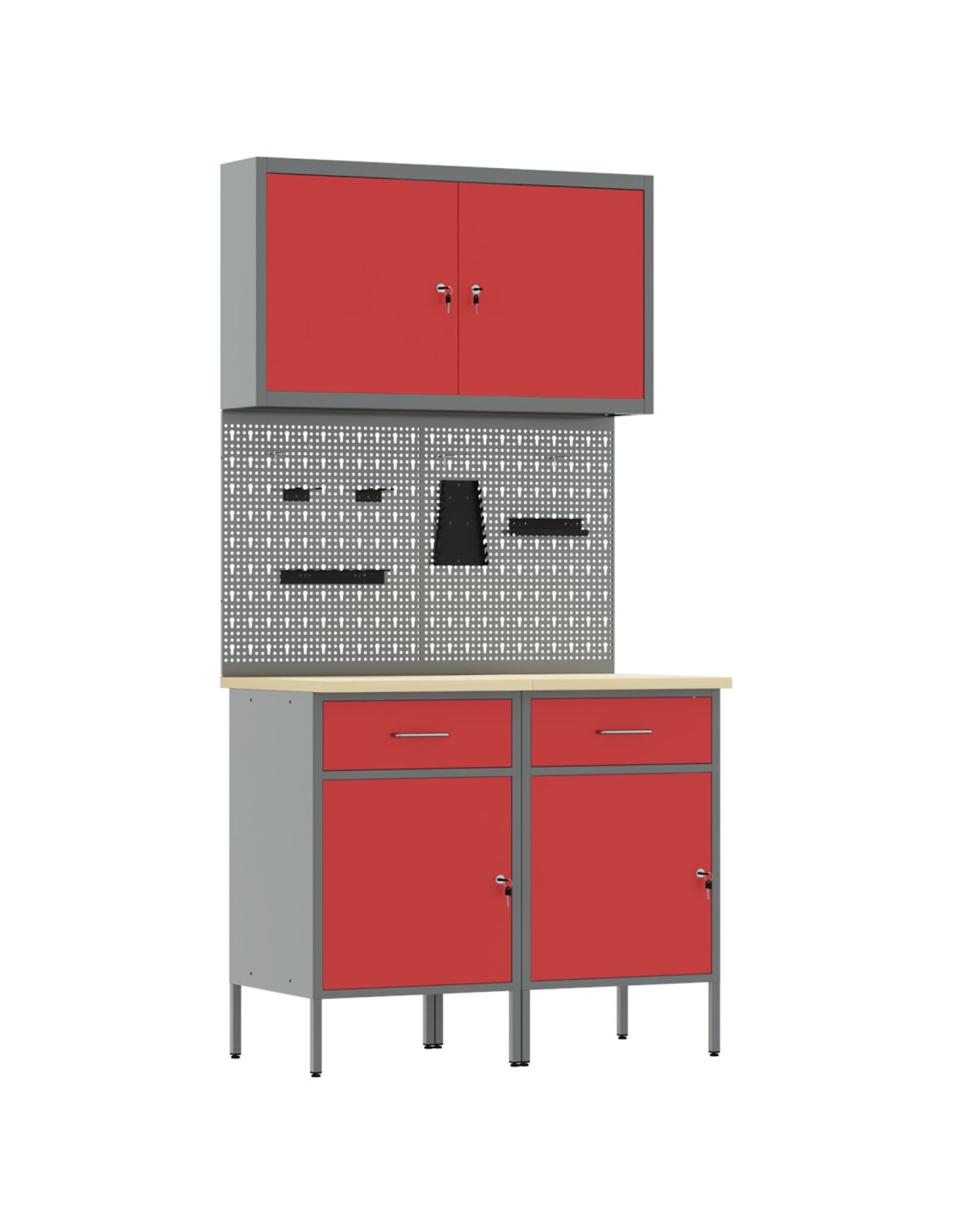 - Telaio in acciaio: Fatto in legno ingegnerizzato e acciaio, questo armadietto è robusto e duraturo, perfetto per il tuo spazio di lavoro. La struttura forte rende sicuro riporre attrezzi pesanti senza preoccupazioni. Anche se è resistente, ha un aspetto elegante, migliorando l'estetica della tua officina. Mantenere pulito basta usarci un panno umido.