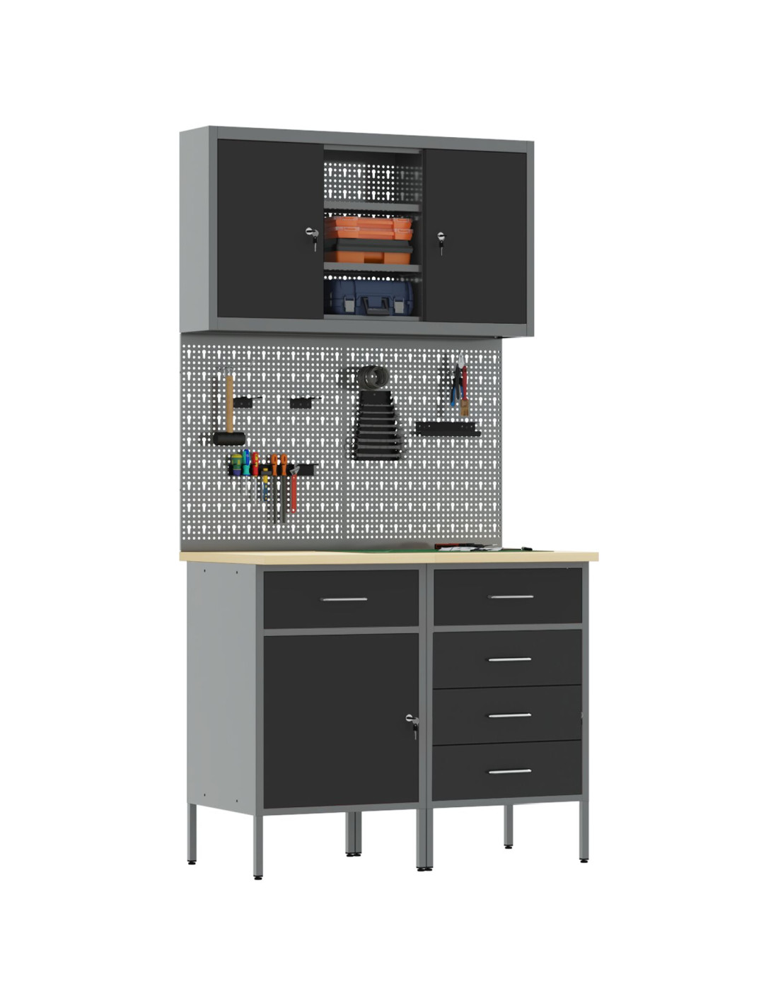 Questo resistente set di armadi da lavoro unisce funzionalità e stile, rendendo il tuo laboratorio interno pratico e bello da vedere. Con un design elegante e moderno, è ideale per chi ama spazi organizzati. È facile da usare e perfetto per mantenere tutto in ordine mentre il tuo posto di lavoro rimane raffinato.