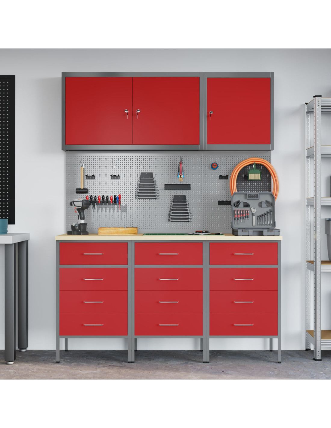 - Telaio in acciaio: Fatto in legno ingegnerizzato e acciaio, questo armadietto è robusto e duraturo, perfetto per il tuo spazio di lavoro. La struttura forte rende sicuro riporre attrezzi pesanti senza preoccupazioni. Anche se è resistente, ha un aspetto elegante, migliorando l'estetica della tua officina. Mantenere pulito basta usarci un panno umido.