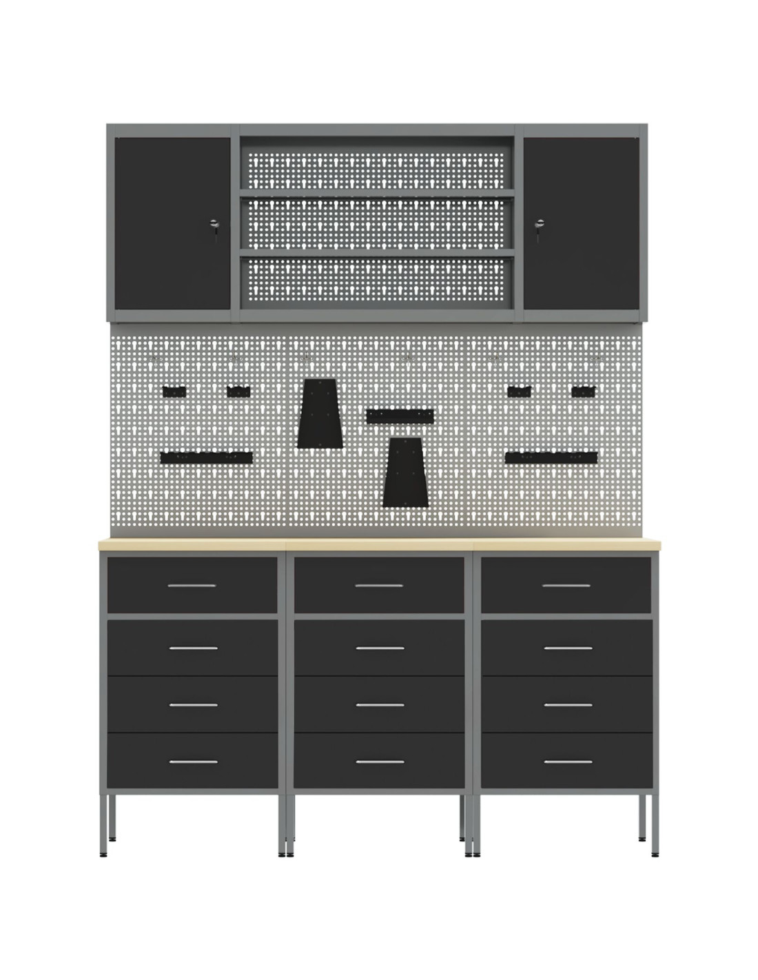 - Telaio in acciaio: Fatto in legno ingegnerizzato e acciaio, questo armadietto è robusto e duraturo, perfetto per il tuo spazio di lavoro. La struttura forte rende sicuro riporre attrezzi pesanti senza preoccupazioni. Anche se è resistente, ha un aspetto elegante, migliorando l'estetica della tua officina. Mantenere pulito basta usarci un panno umido.