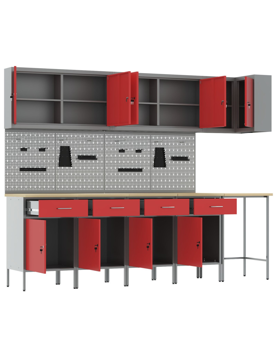 - Materiali: Questo set è realizzato in acciaio verniciato e legno ingegnerizzato, garantendo solidità e affidabilità per lo stoccaggio degli attrezzi. I materiali scelti sono resistenti e assicurano un uso prolungato. La superficie verniciata offre una buona protezione, aumentando la durata dell'armadietto.