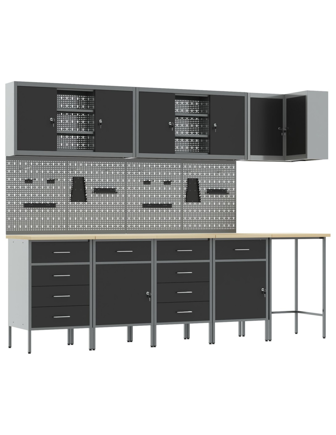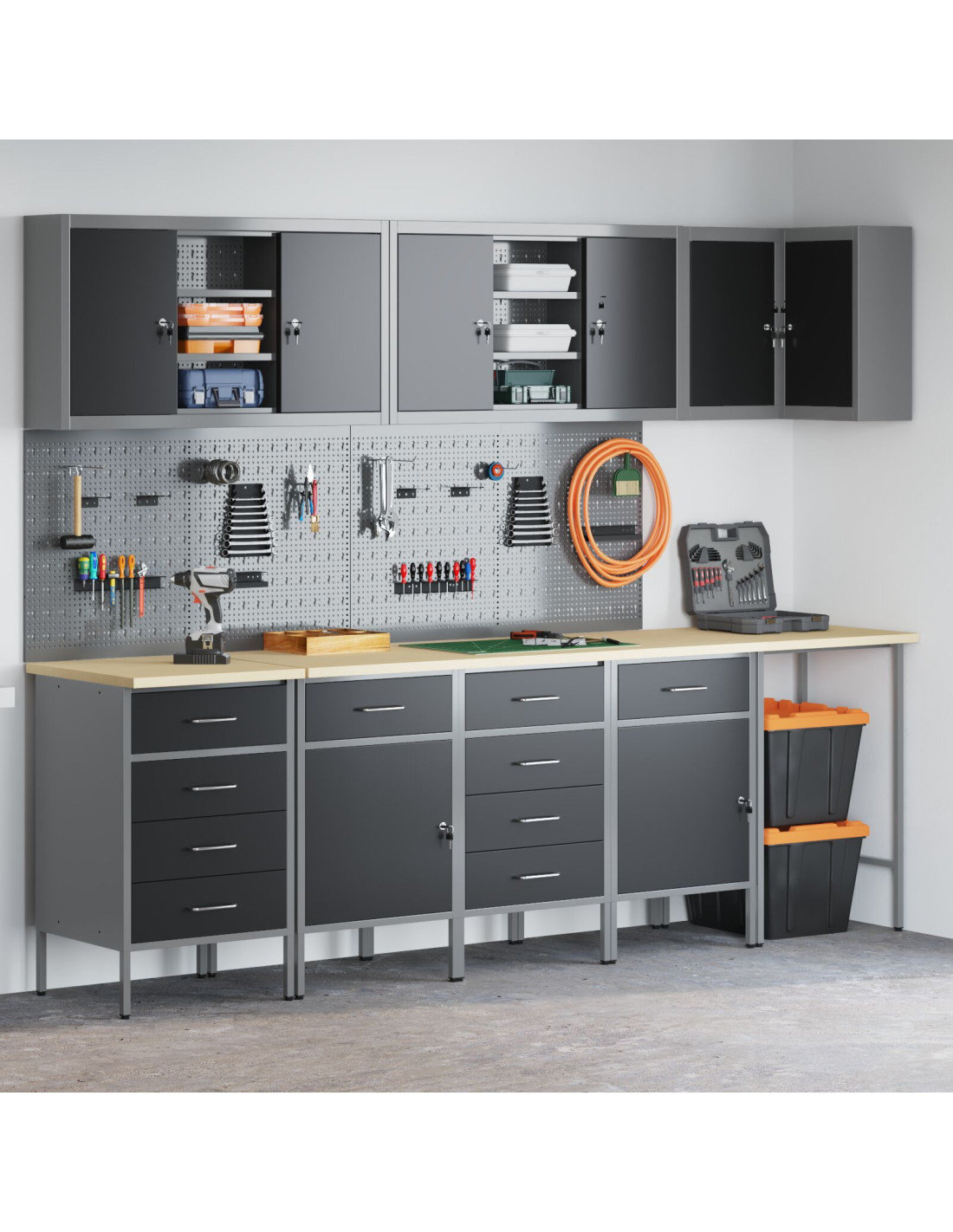 - Materiali: Questo set è realizzato in acciaio verniciato e legno ingegnerizzato, garantendo solidità e affidabilità per lo stoccaggio degli attrezzi. I materiali scelti sono resistenti e assicurano un uso prolungato. La superficie verniciata offre una buona protezione, aumentando la durata dell'armadietto.