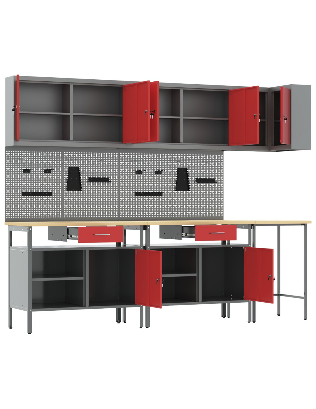 - Materiali: Questo set è realizzato in acciaio verniciato e legno ingegnerizzato, garantendo solidità e affidabilità per lo stoccaggio degli attrezzi. I materiali scelti sono resistenti e assicurano un uso prolungato. La superficie verniciata offre una buona protezione, aumentando la durata dell'armadietto.