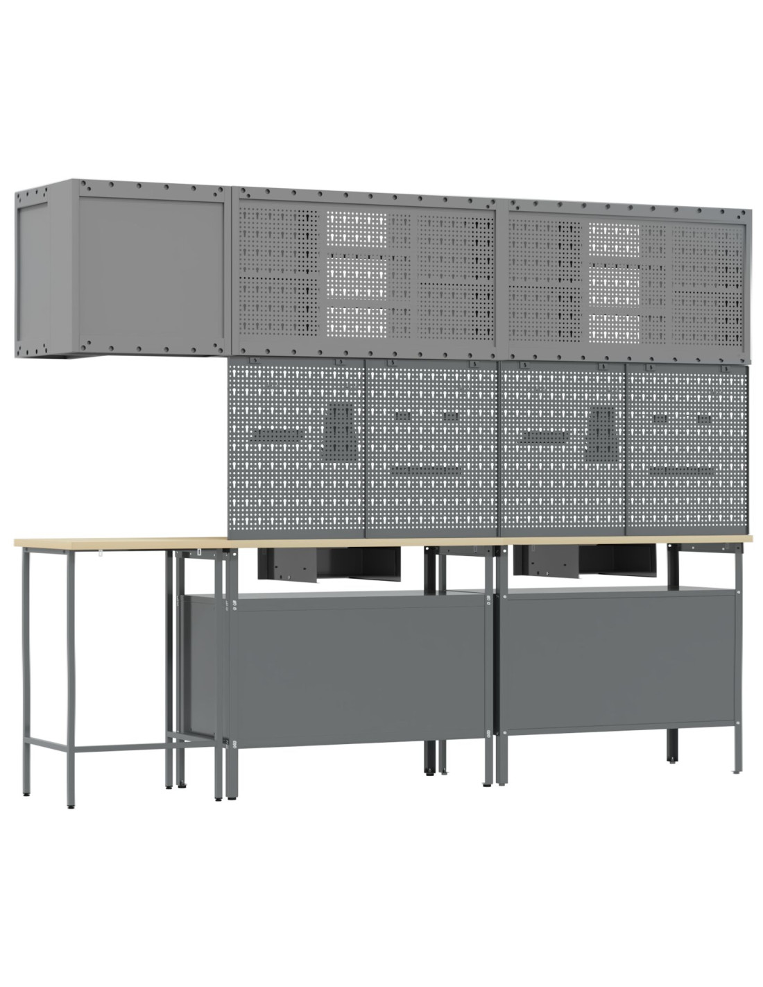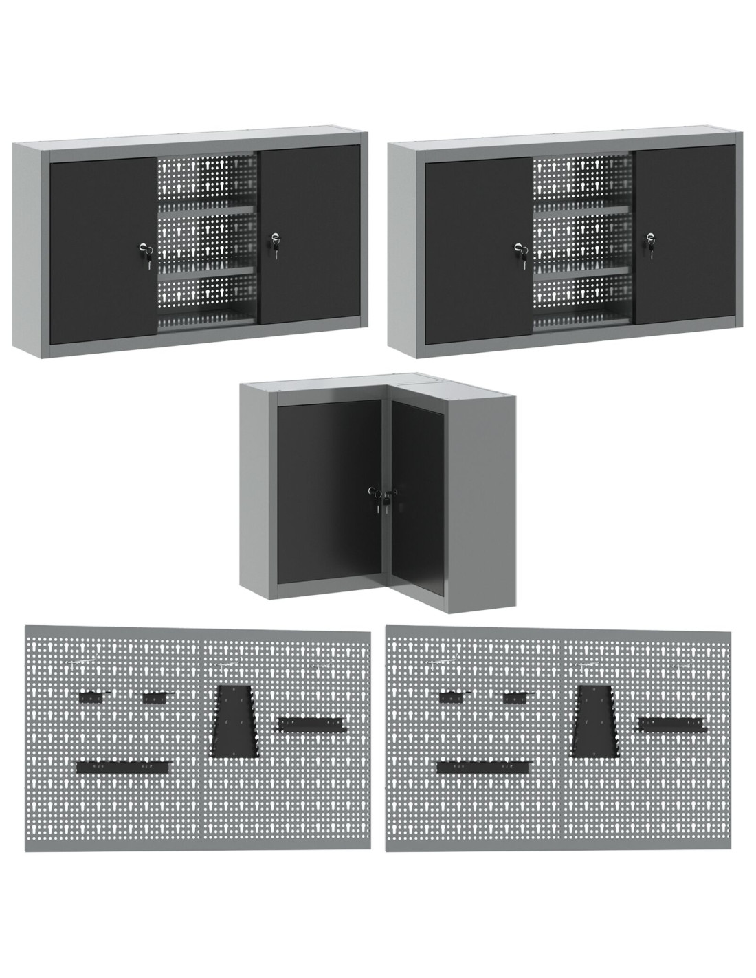 - Materiali: Questo set è realizzato in acciaio verniciato e legno ingegnerizzato, garantendo solidità e affidabilità per lo stoccaggio degli attrezzi. I materiali scelti sono resistenti e assicurano un uso prolungato. La superficie verniciata offre una buona protezione, aumentando la durata dell'armadietto.