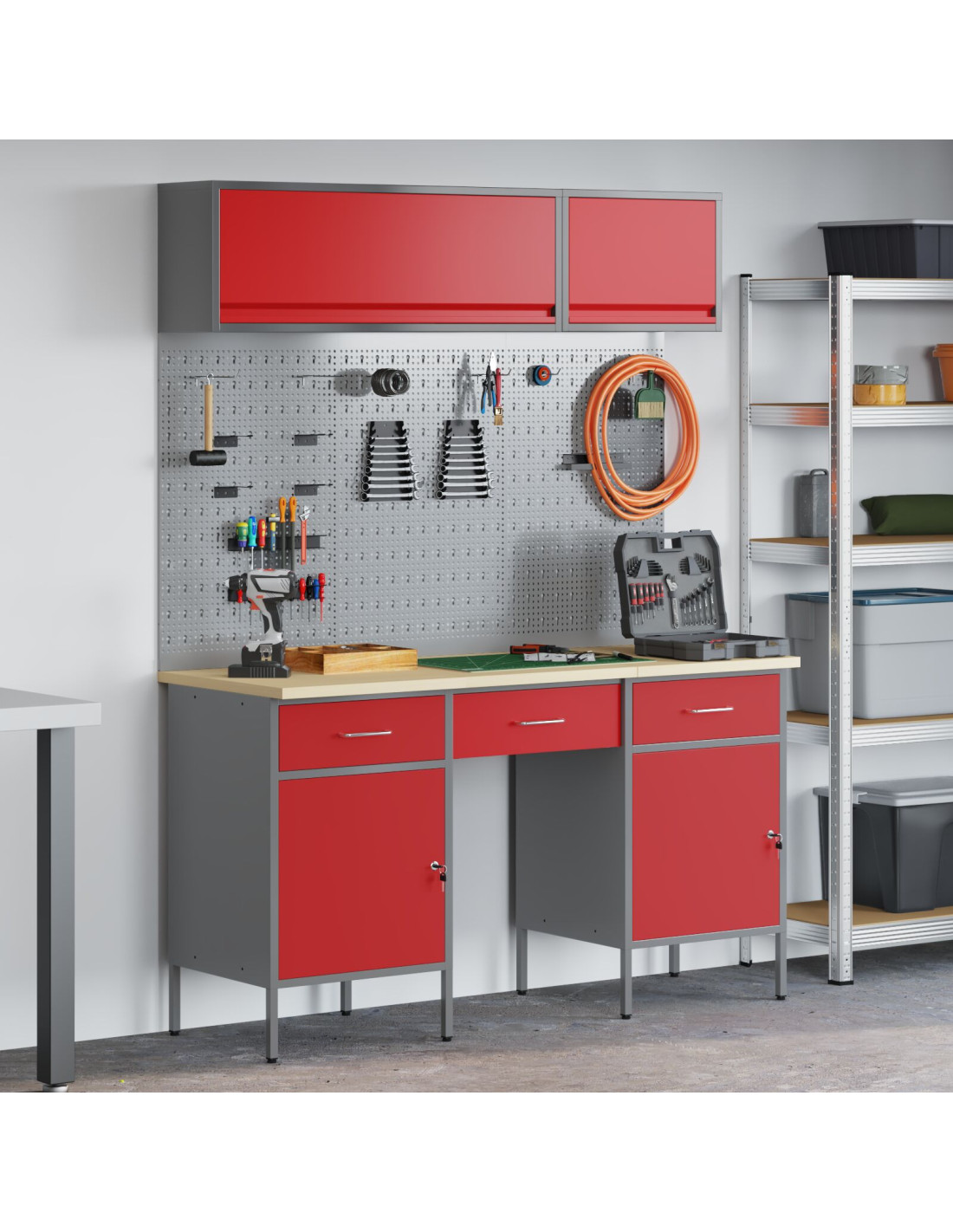Questo resistente set di armadi da lavoro unisce funzionalità e stile, rendendo il tuo laboratorio interno pratico e bello da vedere. Con un design elegante e moderno, è ideale per chi ama spazi organizzati. È facile da usare e perfetto per mantenere tutto in ordine mentre il tuo posto di lavoro rimane raffinato.