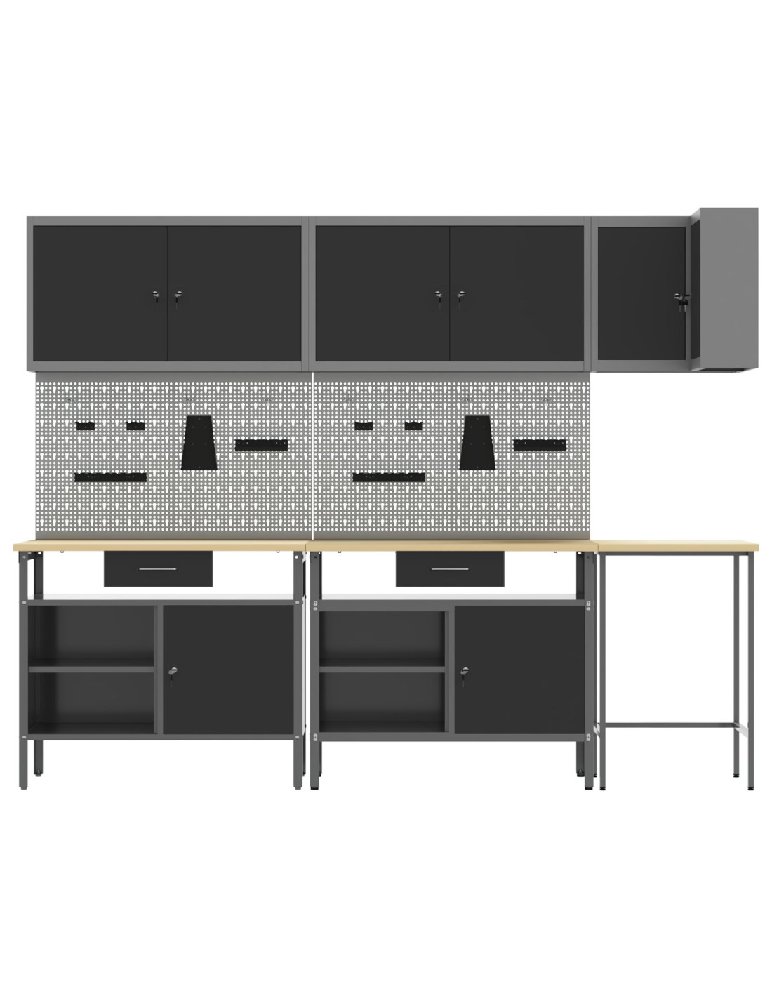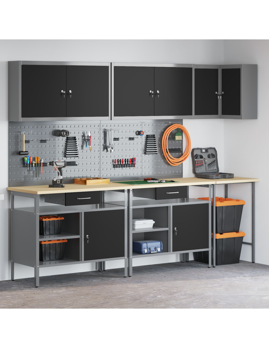 - Materiali: Questo set è realizzato in acciaio verniciato e legno ingegnerizzato, garantendo solidità e affidabilità per lo stoccaggio degli attrezzi. I materiali scelti sono resistenti e assicurano un uso prolungato. La superficie verniciata offre una buona protezione, aumentando la durata dell'armadietto.