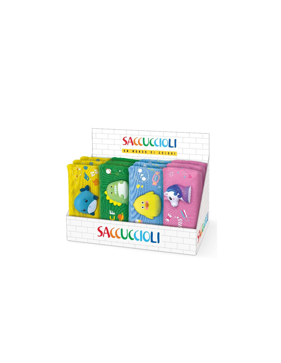 Taschetta Squishy con zip in tessuto con squishy misura 21 x 9 5 x 3 5 cm in espositore da banco.