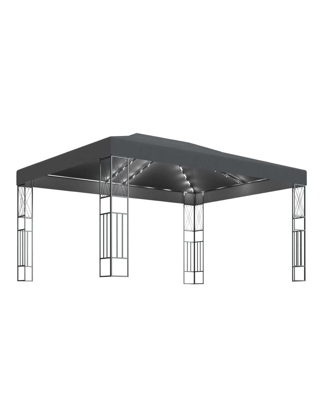Il baldacchino ventilato impedirà al sole e alla pioggia di rovinare il divertimento durante le riunioni di famiglia, i barbecue, i picnic pomeridiani e le feste di compleanno. Il gazebo ha una robusta struttura in acciaio con dettagli decorativi a forma di croce e un tetto in poliestere. Il baldacchino può essere facilmente fissato al telaio in acciaio. Inoltre, la luce della stringa crea un'atmosfera accogliente nel vostro giardino quando il sole tramonta. Le luci non inquinano l'ambiente in quanto vengono caricate dall'energia solare durante il giorno.