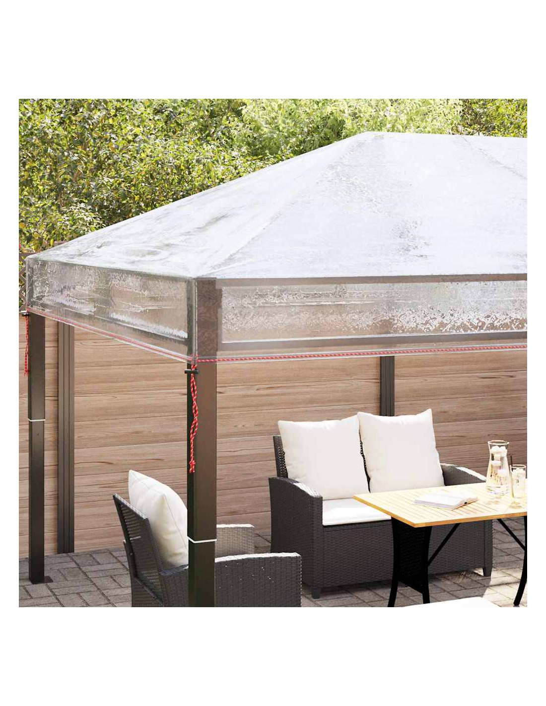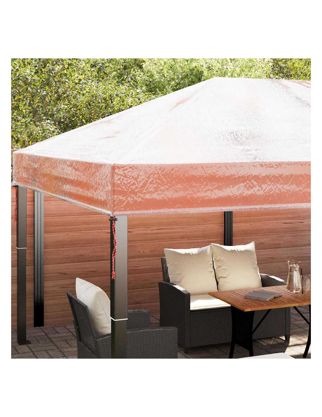 - Materiale in PVC di qualità Questa copertura per gazebo è realizzata con cura in PVC di alta qualità, garantendo durata e stile. Il tessuto resistente resiste a tutte le condizioni atmosferiche, offrendo una barriera sicura contro vento e pioggia. Il suo design trasparente si integra alla perfezione in vari contesti, completando diversi stili esterni.