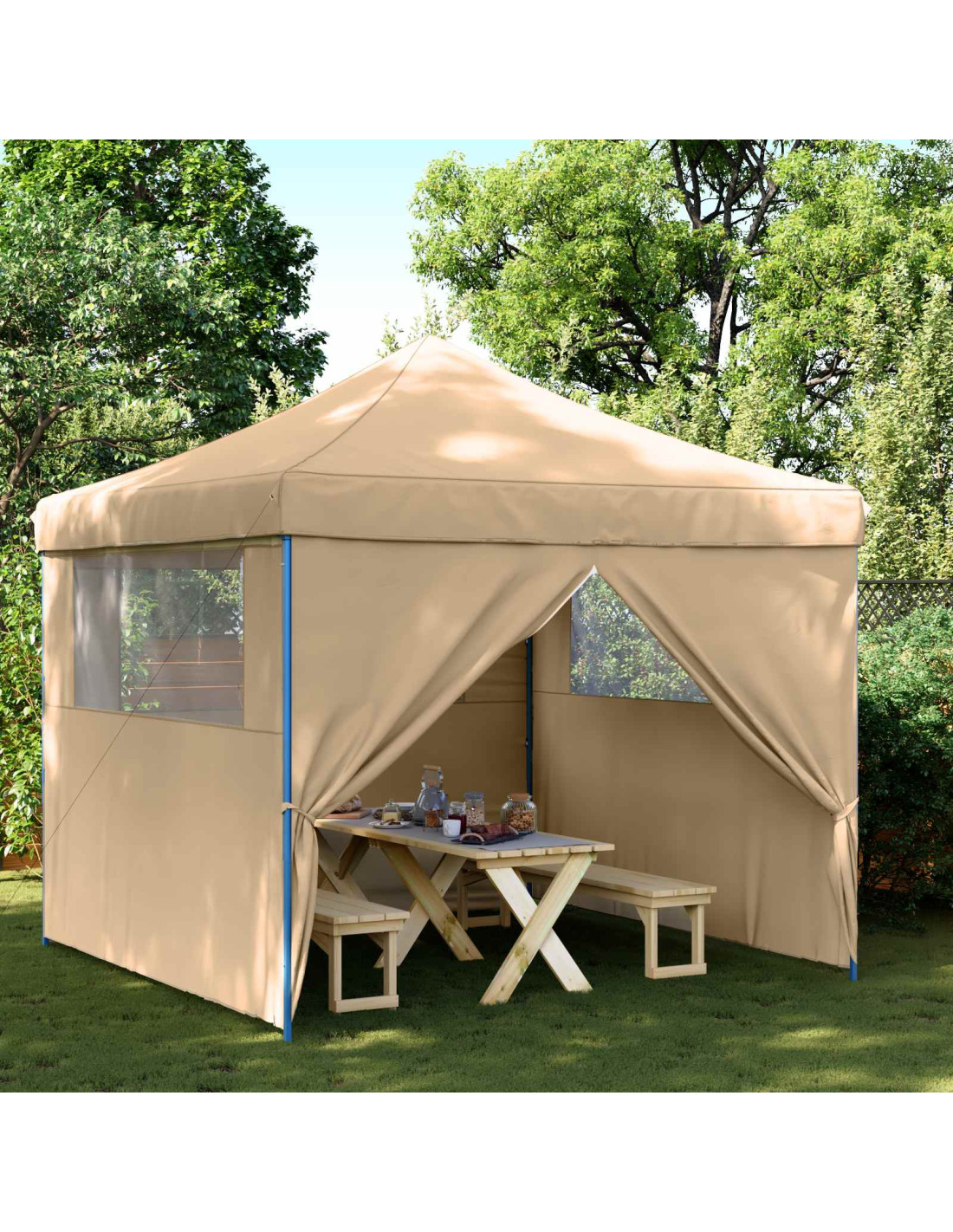 - Materiale in tessuto Oxford: La tenda per feste è fatta di tessuto Oxford, noto per la sua durata e resistenza alle intemperie. Questo materiale resiste a leggera umidità, mantenendo la tenda in ottime condizioni anche con qualche goccia d'acqua.