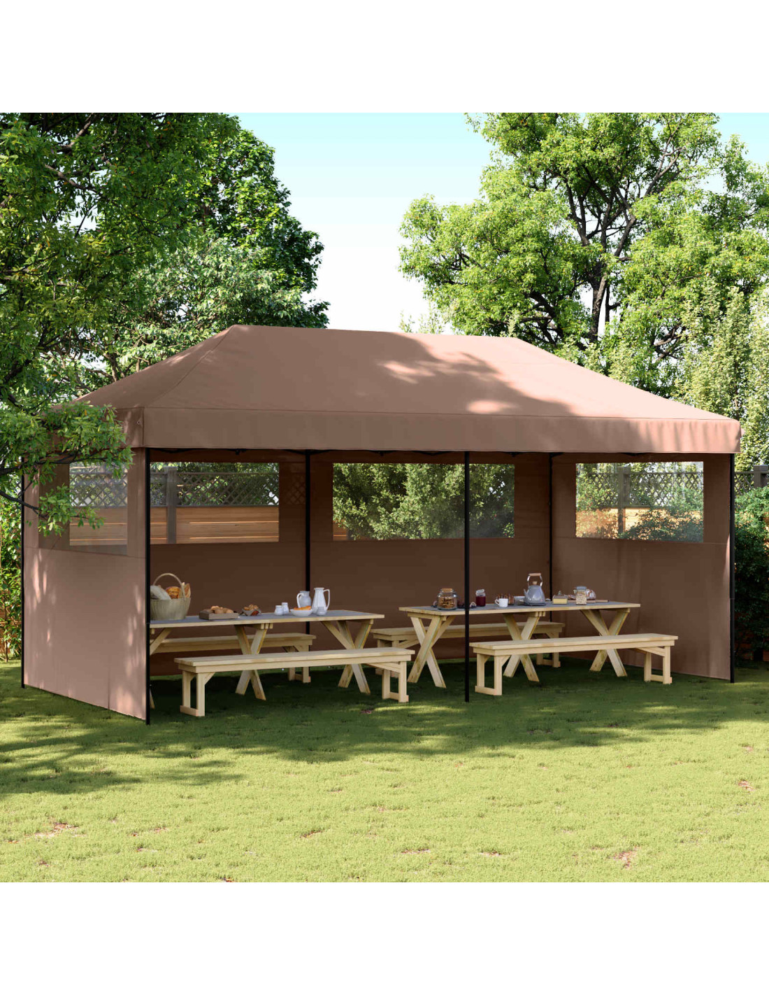 - Tessuto Oxford resistente all'acqua Realizzato in tessuto Oxford, questo gazebo offre un riparo sicuro da piogge inaspettate e sole cocente. Anche se è resistente all'acqua e garantisce un certo comfort, non è consigliabile usarlo in caso di maltempo intenso. Grazie alla sua qualità, mantiene colori e funzionalità nel tempo, rendendolo essenziale per eventi all'aperto.
