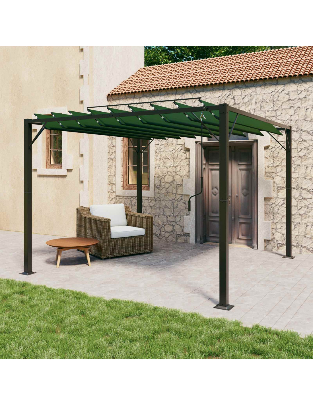 - Tetto a lamelle manuale regolabile per controllare luce e ombra