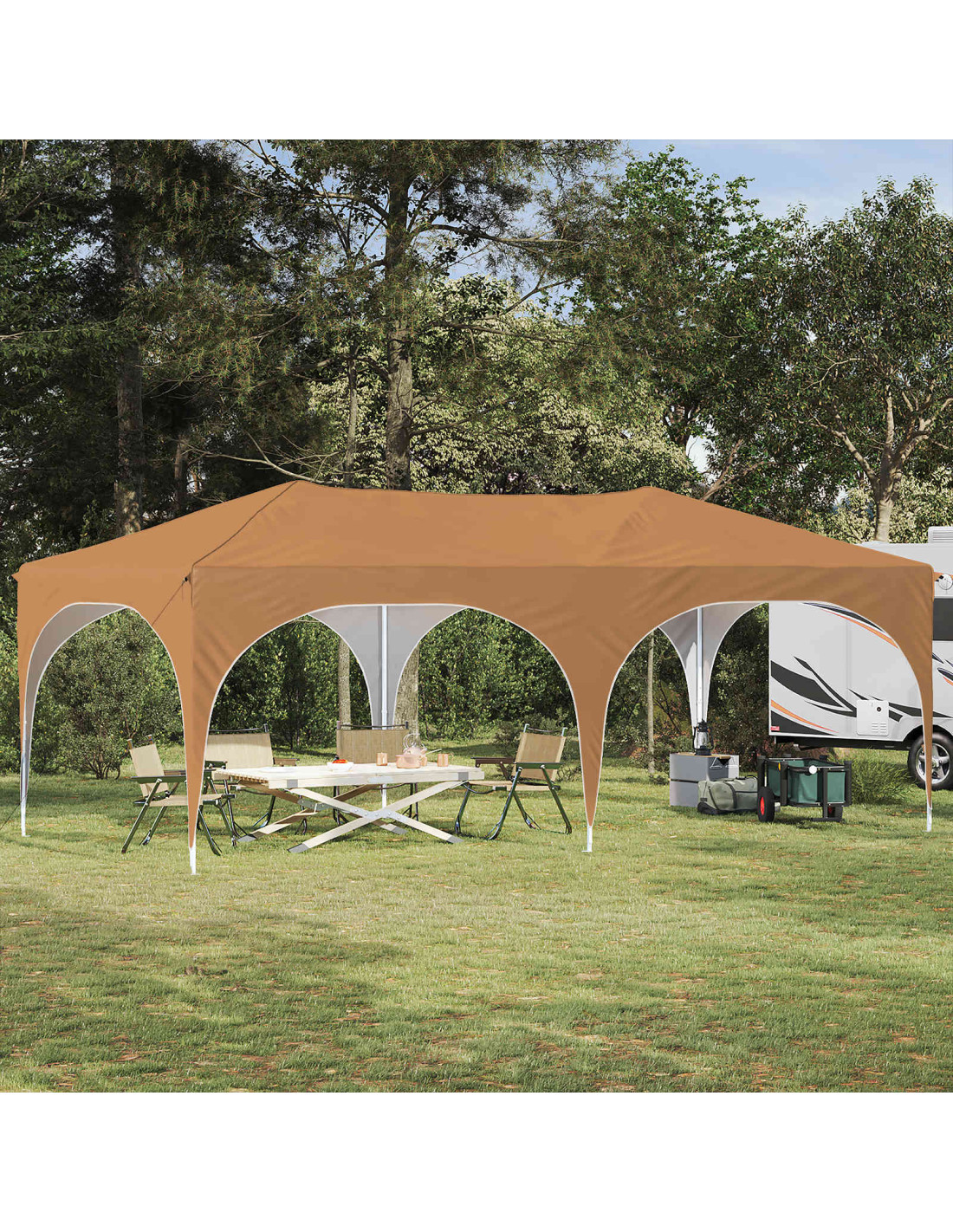 Questa tenda pop-up è perfetta per rendere gli eventi all'aperto indimenticabili. Con il suo tessuto Oxford di alta qualità, ha un look moderno, linee pulite e tanta funzionalità. Che tu stia organizzando una festa in giardino, un matrimonio o un grande evento, questa tenda offre tanto spazio e un'atmosfera elegante. Con la sua copertura ampia è un perfetto mix di stile e praticità, migliorando qualsiasi ritrovo con la sua presenza. Tessuto Oxford durevole: Il materiale principale è la stoffa Oxford, che offre resistenza a diversi tipi di clima. Grazie alle sue proprietà impermeabili e alla protezione UV, tiene al caldo gli ospiti e gli arredi, anche sotto il sole e la pioggia leggera, rendendo gli spazi esterni utilizzabili senza interruzioni. Regolazione dell'altezza: Con tre impostazioni di altezza, questa tenda è super adattabile per eventi di tutte le dimensioni. Sia per una riunione intima che per una grande festa, puoi cambiare l'altezza per ottenere la copertura perfetta. Set-up completo: È dotata di tutto il necessario, comprese 4 corde per il vento e 8 picchetti, per garantirne stabilità anche con vento forte. Montarla è semplice: basta due persone e un martello, rendendola pratica e affidabile. Convenienza pop-up: Questo design intelligente rende l'installazione super veloce, così non hai il fastidio di lunghi montaggi. Perfetta per chi ha poco tempo, ti fa risparmiare energie e ti permette di accogliere gli ospiti all'istante. Istruzioni per la cura: Per tenerla in ottime condizioni, eviti prodotti chimici aggressivi. In questo modo, i materiali e la struttura durano a lungo, permettendo a tutti di godere del suo aspetto e delle sue caratteristiche pratiche senza segni di usura.