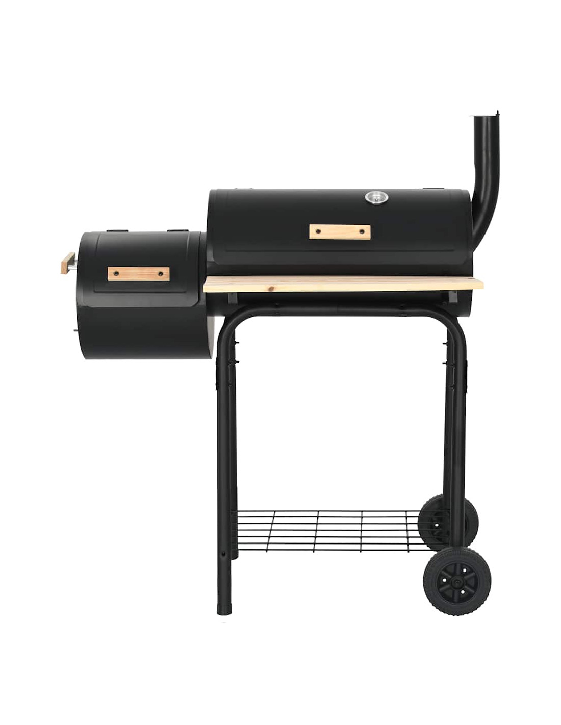 L'affumicatore contiene anche un ripiano nella parte anteriore e un ripiano sottostante dove è possibile posizionare spezie, ingredienti, utensili e altri elementi essenziali del barbecue. Dotato di 2 ruote, può essere facilmente spostato per feste all'aperto, picnic e raduni.