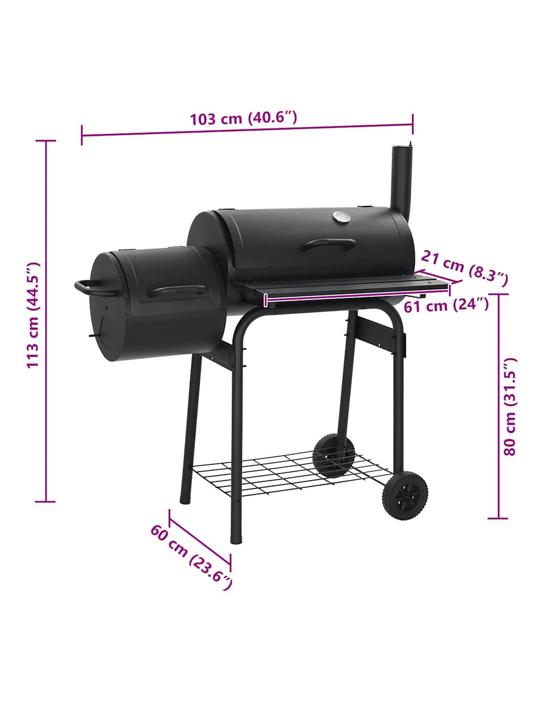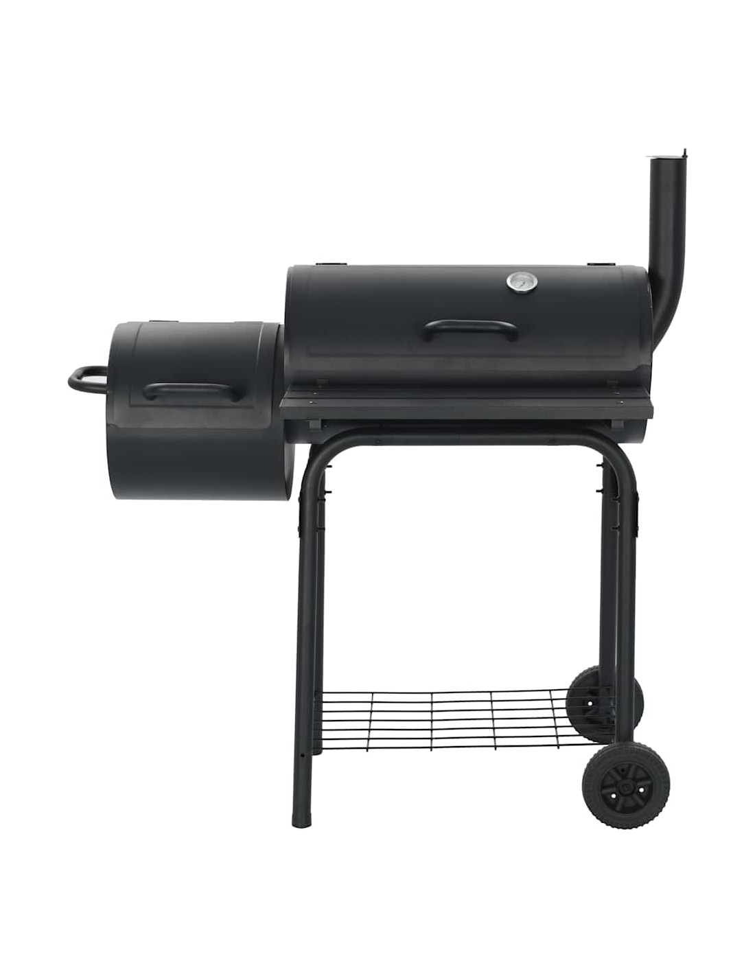 L'affumicatore contiene anche un ripiano nella parte anteriore e un ripiano sottostante dove è possibile posizionare spezie, ingredienti, utensili e altri elementi essenziali del barbecue. Dotato di 2 ruote, può essere facilmente spostato per feste all'aperto, picnic e raduni.