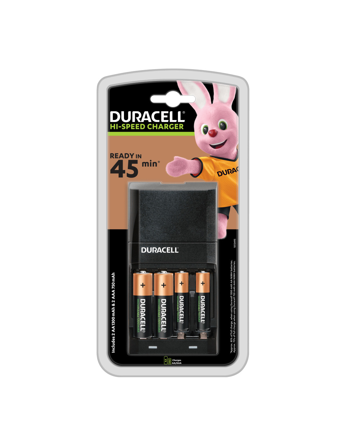 Caricabatterie Duracell Hi-Speed Charger - cariche in 45 minuti* (*approsimativivamente l'85% della piena carica, quando sono caricate le batterie Duracell 1300mAh AA NiMH. Approssimativamente il 75% della piena carica, quando sono usate le batterie Duracell 750mAh AAA NiMH). Quando sei sempre in movimento, e non hai semplicemente il tempo di aspettare che le batterie si ricarichino. Che tu voglia mantenere i tuoi bambini intrattenuti con un controller da gioco completamente carico, o scattare infinite istantanee della tua vita emozionante - hai bisogno di batterie su cui puoi contare ovunque tu vada. Il Caricabatterie Duracell Hi-Speed Charger è la tua soluzione veloce e portatile per aiutarti a rimanere in moto invece di doverti fermare a causa delle batterie scariche.Le sue 9 funzioni di sicurezza ti permettono di continuare la carica senza preoccupazioni, e dopo che le batterie sono completamente cariche, il caricabatterie si può spegnere automaticamente per prevenire il surriscaldamento. Questo caricabatterie possiede una garanzia di 10 anni della Duracell, grazie a cui puoi contare ogni giorno sull'energia di lunga durata Duracell. Continua a vivere la tua vita sulla corsia di sorpasso e lascia che le tue batterie ti accompagnino - ovunque tu vada.