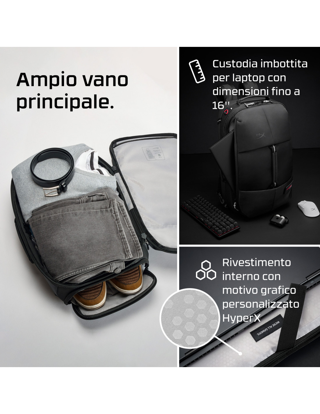 Lo zaino HyperX Knight Gaming Backpack è stato pensato per i gamer che non vogliono rischiare di compromettere le loro prestazioni lasciando a casa il proprio kit. Con la sua apertura a conchiglia semplifica al massimo la preparazione della tua postazione di gioco, ovunque ti trovi. Grazie al classico stile HyperX, questo zaino ti consente di esprimere la tua passione per HyperX e per il gaming ovunque tu vada. L'ampio volume interno di HyperX Knight ti consente di riporre in tutta sicurezza un laptop fino a 16 pollici e tutti i dispositivi essenziali del tuo kit di gioco come controller, tastiera, tablet e altro ancora. All'interno sono disponibili anche scomparti per cavi, penne, power bank e altri importanti accessori. Gli scomparti sono facilmente accessibili, per consentirti di avere il contenuto dello zaino sempre sotto controllo. La pratica tasca ad accesso rapido, inoltre, offre ancora più spazio per eventuali snack o altri oggetti utili. Non ti va di portare pesi sulla schiena? Puoi sempre togliere gli spallacci e usare la resistente tracolla regolabile, oppure sfruttare il passante per fissare lo zaino a un trolley.