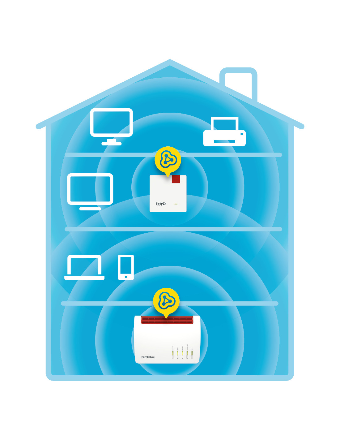 Il FRITZ!Repeater estende efficientemente la portata delle reti wireless esistenti e quindi è la soluzione ideale per disporre di una rete wireless più estesa in tutta la casa.
