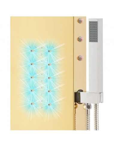La colonna doccia è realizzata in resistente acciaio inossidabile con finitura a specchio oro, caratterizzata da un bellissimo design curvo. Ha quattro funzioni: pioggia, cascata, getti massaggianti e soffione a mano, facilmente selezionabili tramite una manopola. Le luci a LED possono essere accese o spente, a seconda della vostra preferenza. La temperatura dell'acqua è regolabile con la manopola del termostato.
