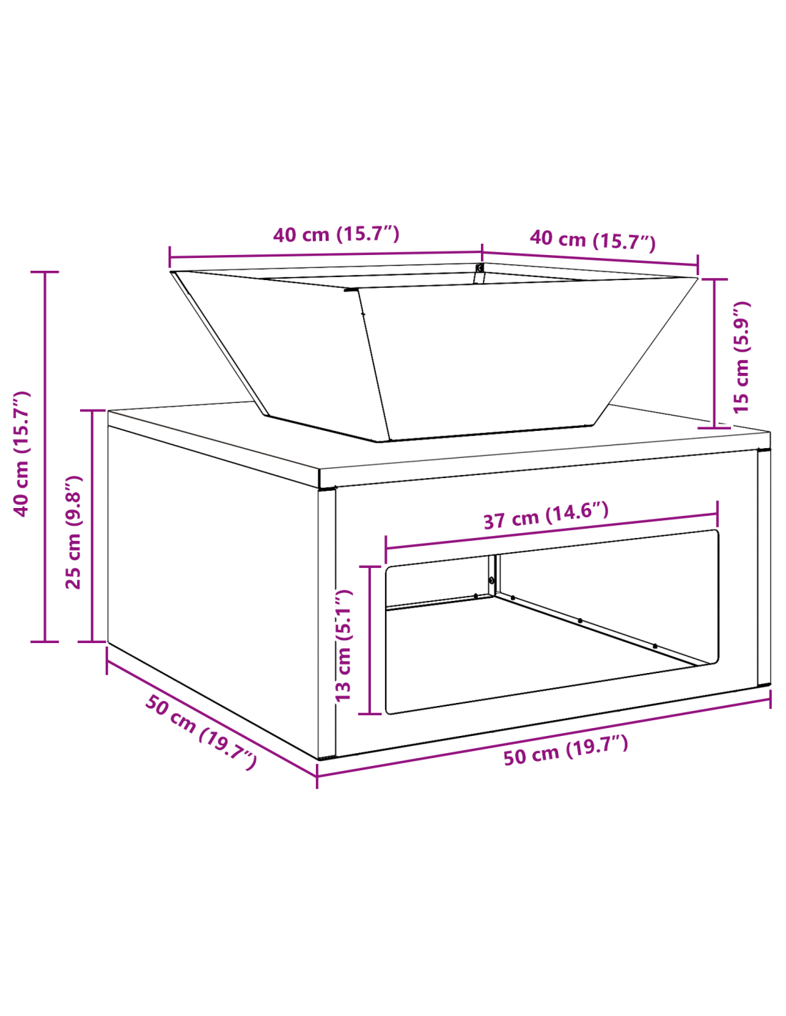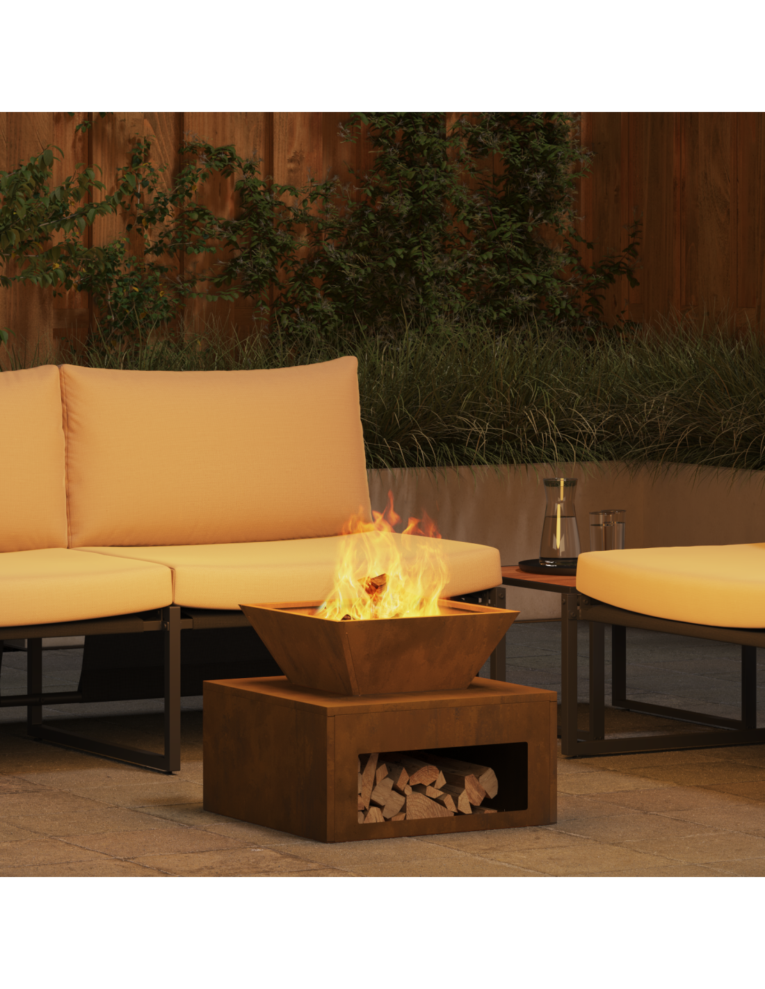 Questo focolare da esterno, realizzato in acciaio robusto, è fatto per resistere a temperature elevate, offrendo calore e atmosfera per le tue riunioni all'aperto. La sua forma cubica e lo stile moderno con linee pulite lo rendono un'aggiunta elegante a ogni giardino o terrazza.