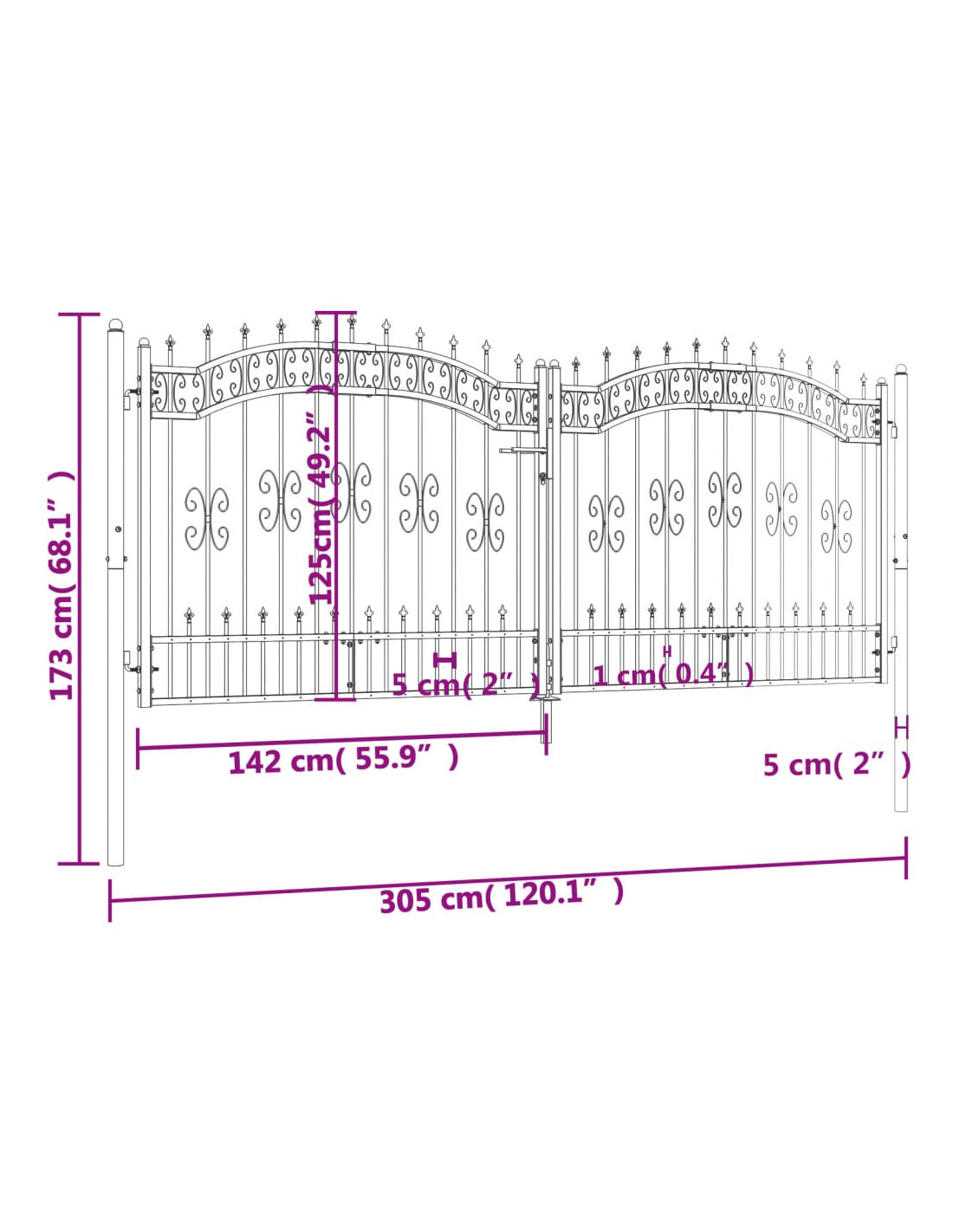 - Design di alta sicurezza: Il cancello fornisce un alto grado di sicurezza, grazie all'elegante design ad arco della parte superiore e ai robusti sostegni orizzontali che rinforzano il telaio e formano un incredibile ingresso per la vostra proprietà.