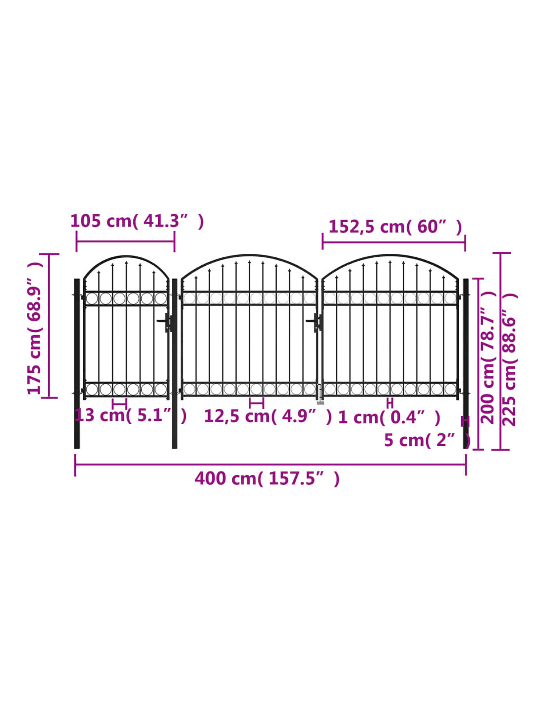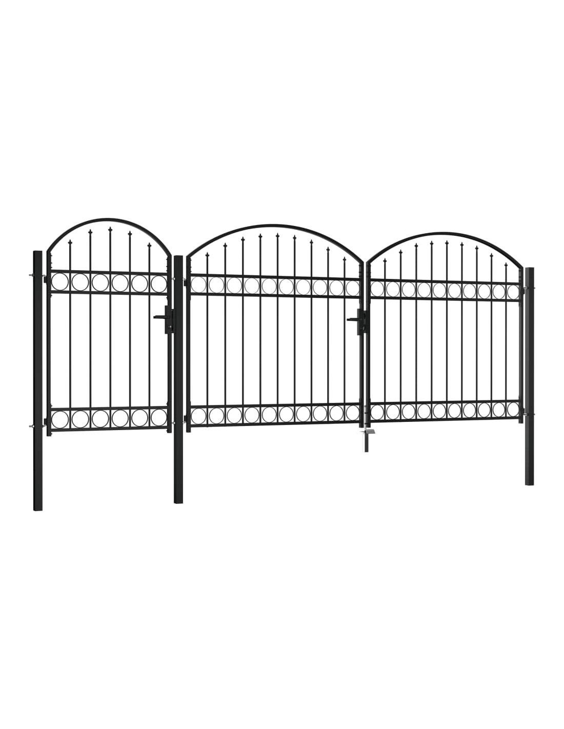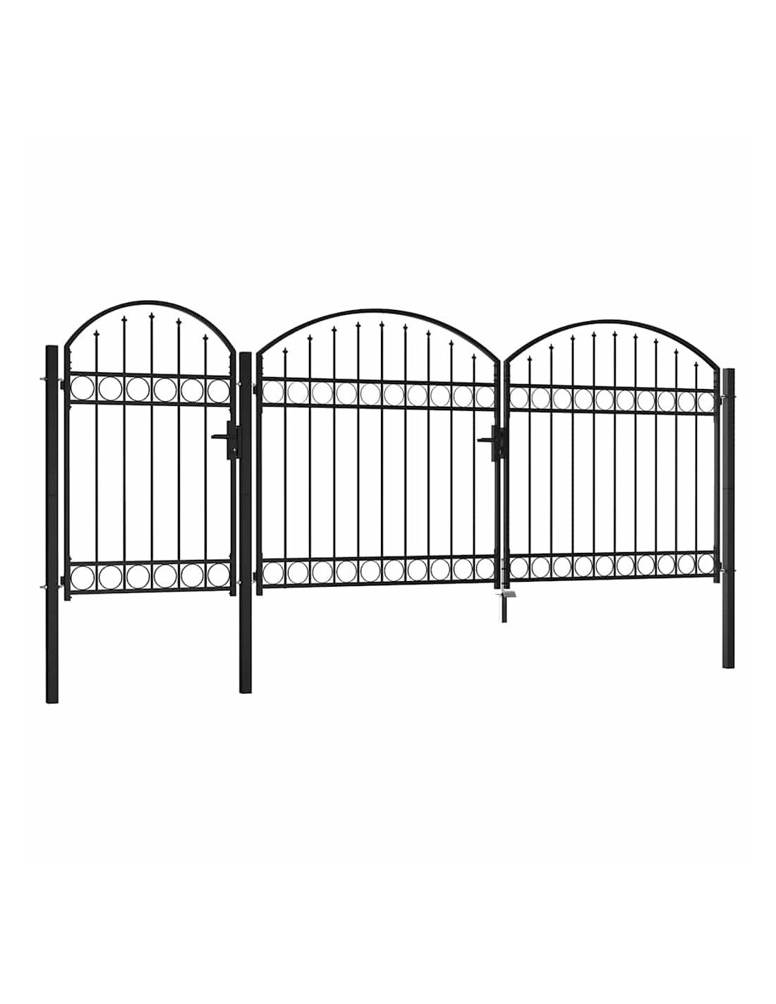 Grazie al design elegante e ad arco, e alle assi orizzontali che ne rinforzano il telaio, il nostro cancello da giardino offre un alto livello di sicurezza, formando un favoloso ingresso sulla vostra proprietà. Fabbricato in acciaio, il cancello è verniciato a polvere contro la ruggine e la corrosione. In aggiunta, questo ingresso è dotato di un sistema di bloccaggio e viene fornito con tre pali robusti, insieme a resistenti cerniere, per una facile installazione. Inoltre le barre di chiusura incluse facilitano il fissaggio in posizione delle due metà del cancello, conferendo una maggiore sicurezza. Questo cancello da giardino costituisce un'eccellente combinazione di stile, forza e robustezza!