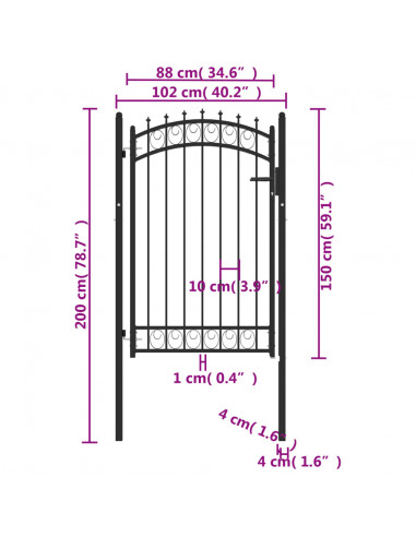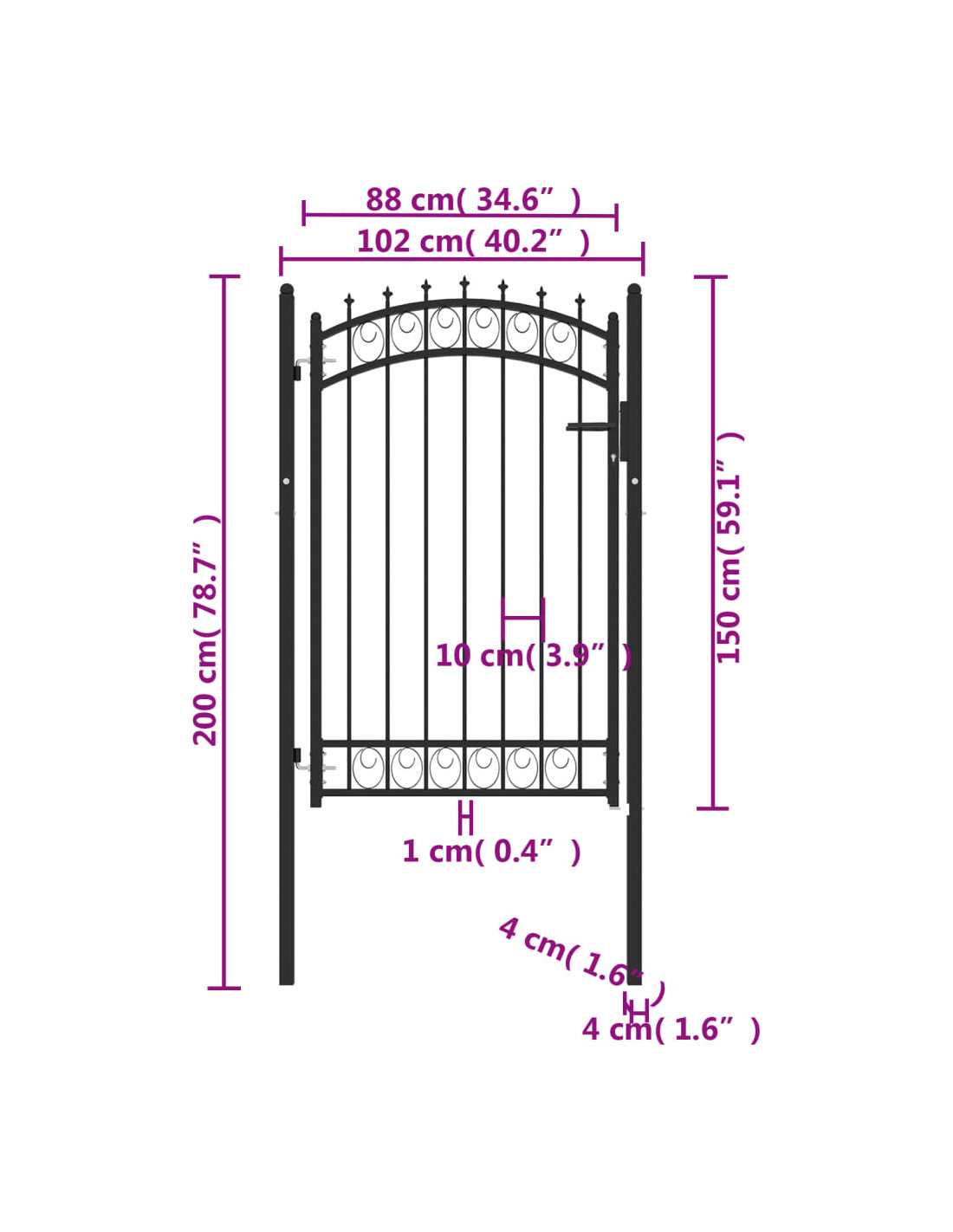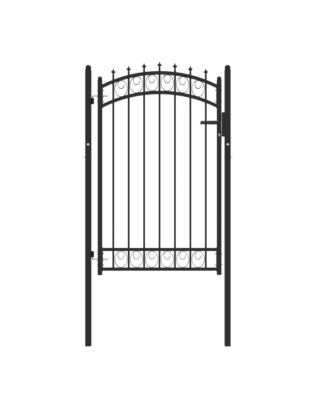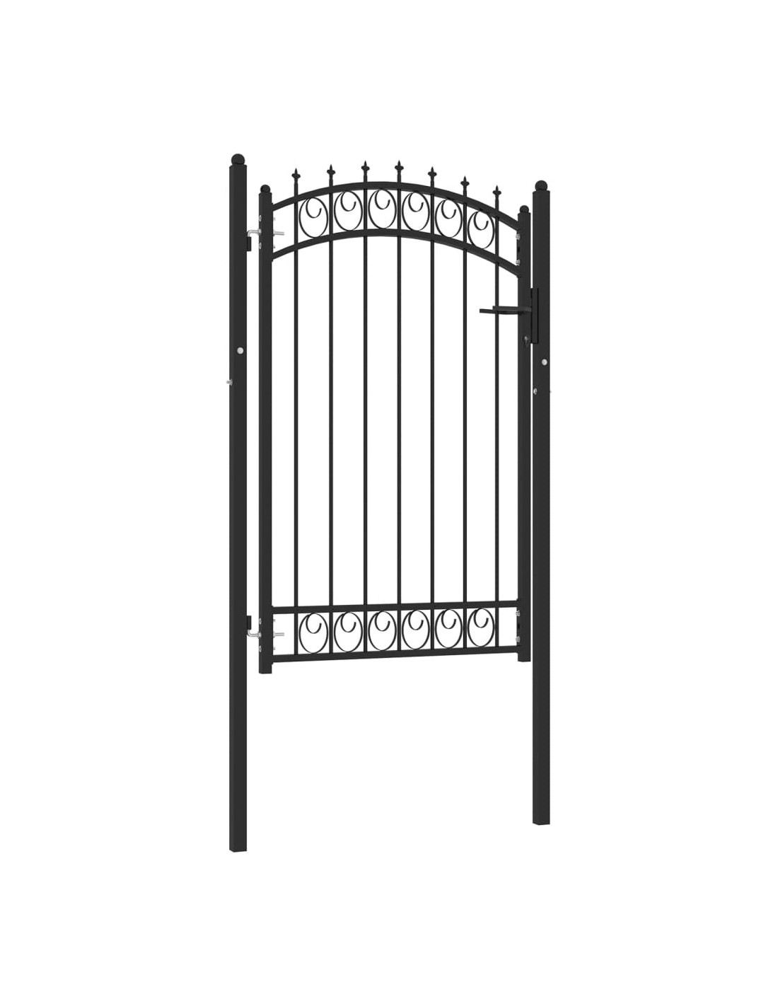 Fabbricato in acciaio robusto, il cancello d'ingresso è verniciato a polvere per resistere a ruggine e corrosione. Grazie alle barre verticali con punte e ai robusti sostegni orizzontali di rinforzo per il telaio, il nostro cancello da giardino offre la massima sicurezza. In aggiunta, il design ad arco conferisce un tono elegante all'ingresso. È inoltre dotato di una serratura con tre chiavi e viene fornito con due pali robusti, dotati di resistenti cerniere, per una facile installazione.