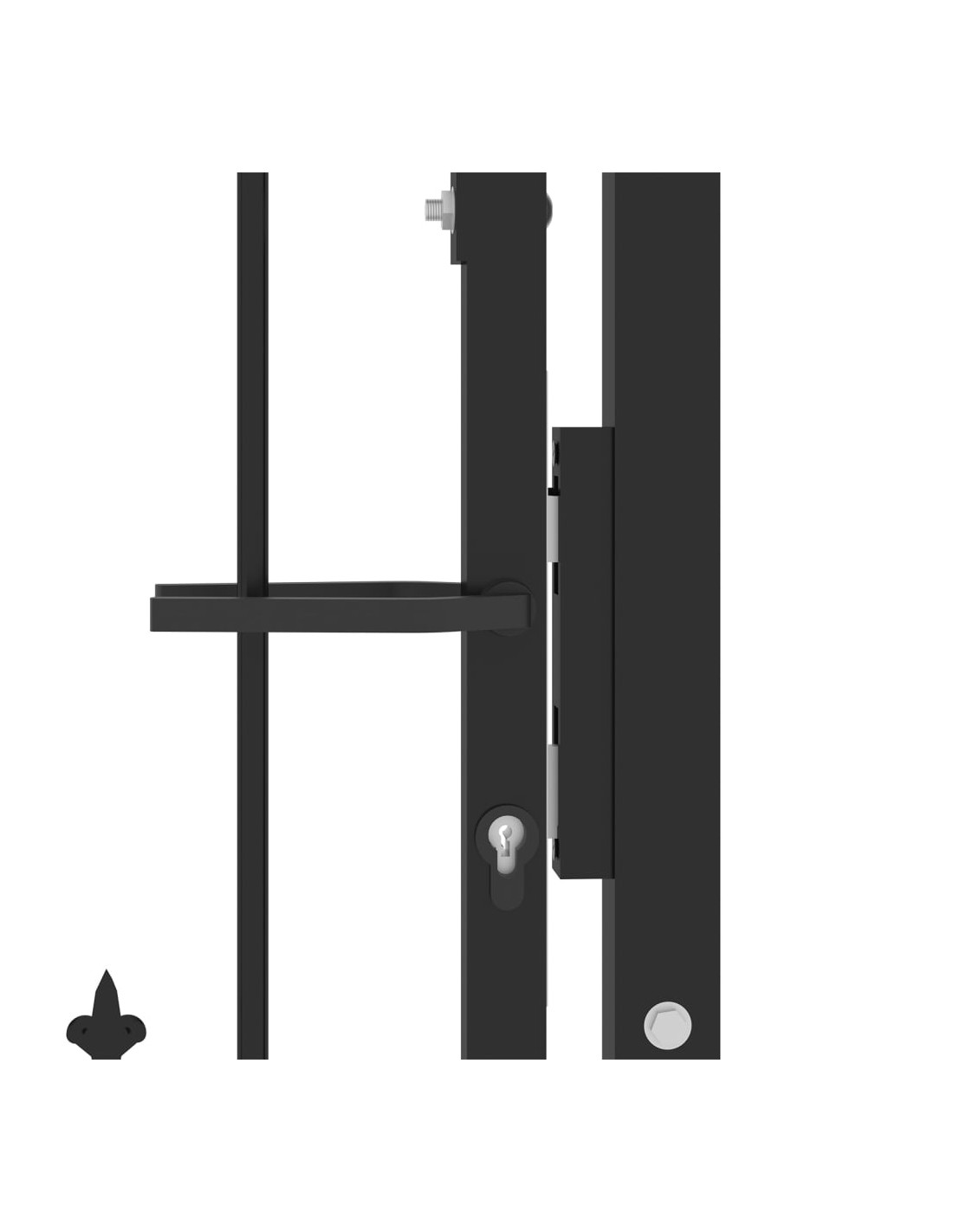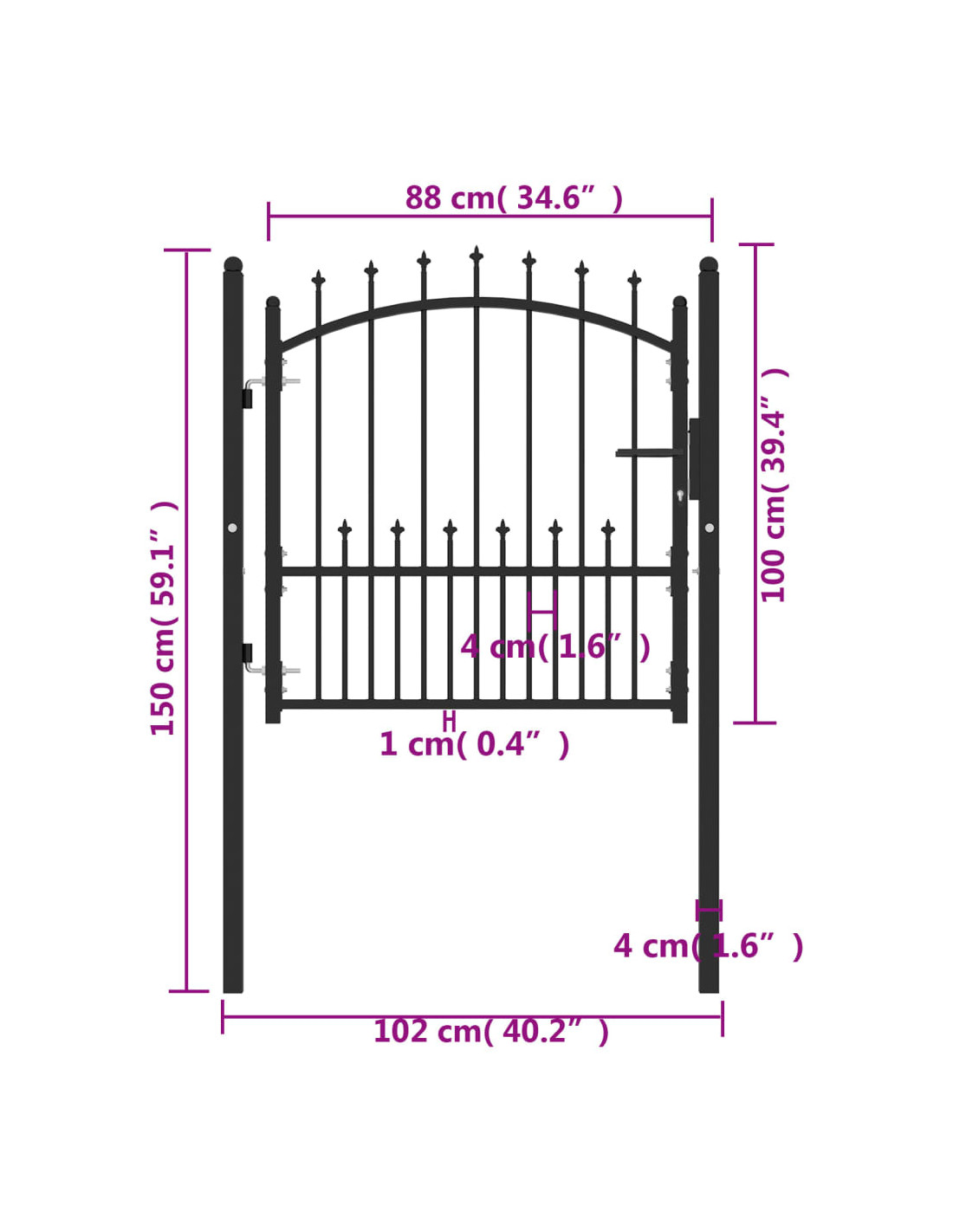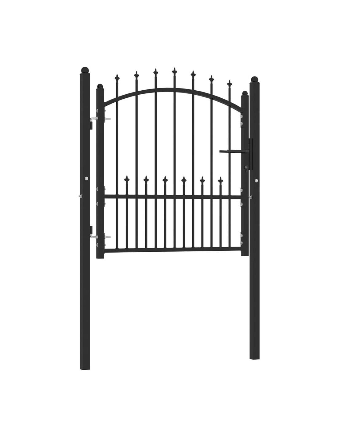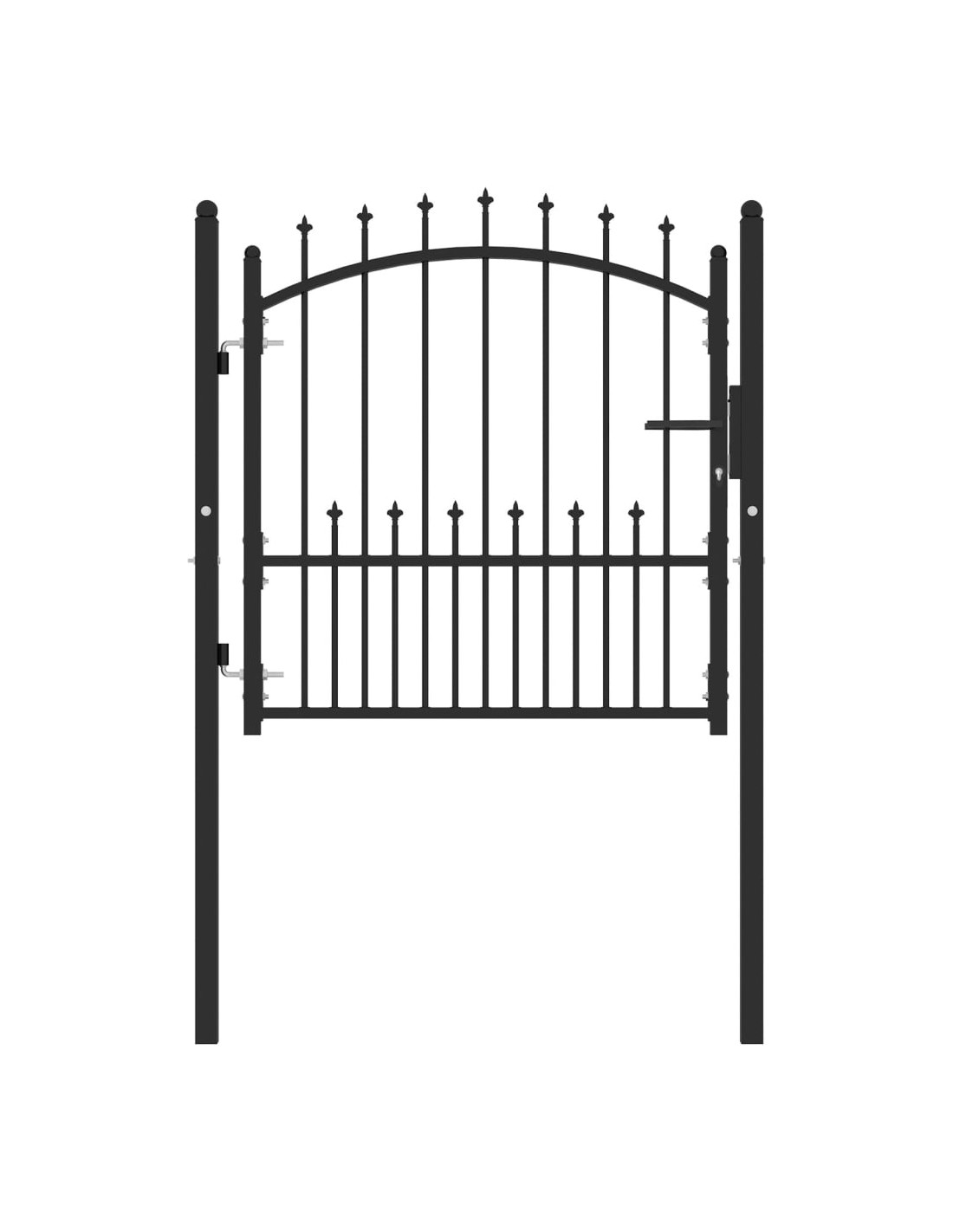 Fabbricato in acciaio robusto, il cancello d'ingresso è verniciato a polvere per resistere a ruggine e corrosione. Grazie alle barre verticali con punte e ai robusti sostegni orizzontali di rinforzo per il telaio, il nostro cancello da giardino offre la massima sicurezza. In aggiunta, il design ad arco conferisce un tono elegante all'ingresso. È inoltre dotato di una serratura con tre chiavi e viene fornito con due pali robusti, dotati di resistenti cerniere, per una facile installazione.
