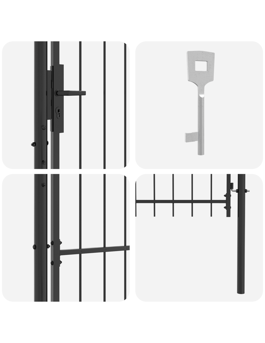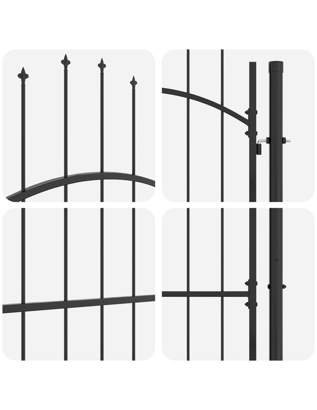 - Costruzione in acciaio: Questo cancello è creato in acciaio resistente, perfetto per affrontare le intemperie. La sua struttura garantisce una durata eccezionale e lo rende una barriera sicura per il tuo spazio esterno.
