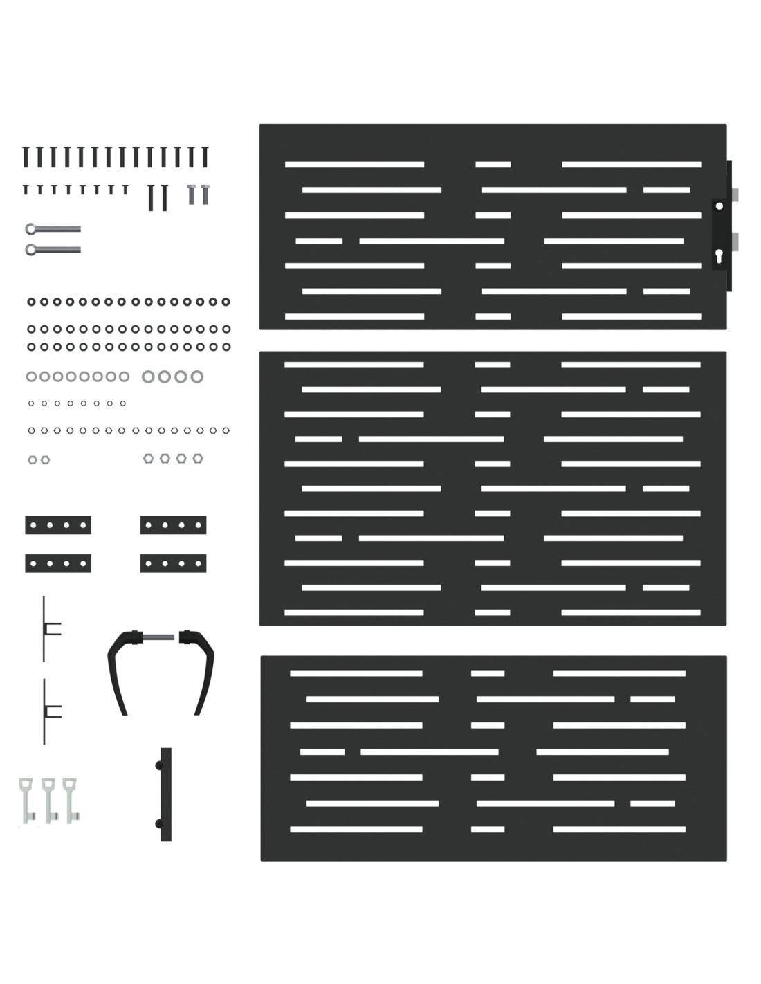 - Componenti Inclusi: Il cancello viene fornito con un lucchetto a cilindro robusto, fatto per garantire maggiore sicurezza. Questo lucchetto è resistente e serve una chiave per aprirlo, rendendo il cancello un'ottima protezione per gli spazi esterni, sia per tenere le cose dentro che per tenere lontani visitatori indesiderati.