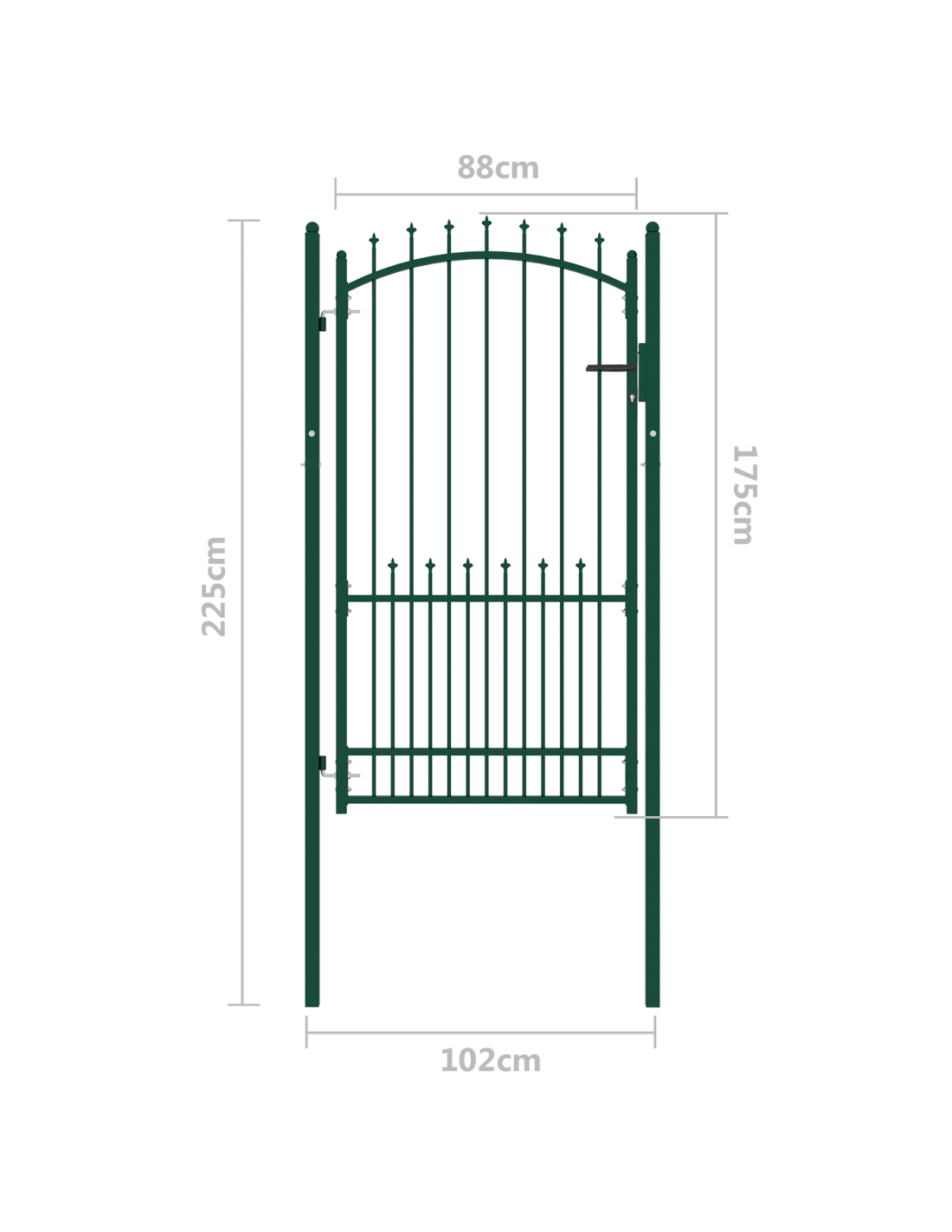 Realizzato in acciaio resistente, il cancello da recinzione ha una struttura robusta ed è stato verniciato a polvere contro ruggine e corrosione. Con le barre verticali dotate di punte e un robusto rinforzo orizzontale come rinforzo, questo cancello da giardino offre un elevato grado di sicurezza. Il design della parte superiore ad arco ne aumenta l'eleganza. È dotato di due robusti montanti con robuste cerniere per una facile installazione e nella consegna è incluso anche un robusto sistema di chiusura con tre chiavi abbinate.
