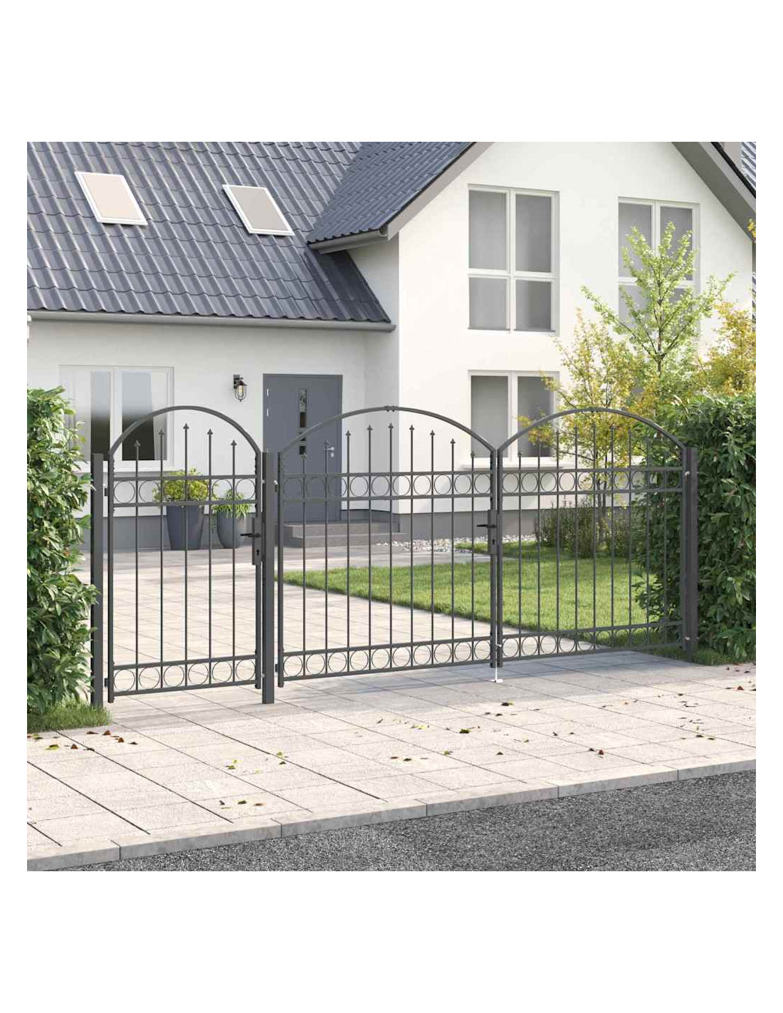 Questo cancello da giardino è resistente e ha una parte superiore arcuata che lo rende moderno, unendo semplicità e praticità. È perfetto per giardini e terrazze. Fatto di acciaio, è resistente all'acqua e smplifica la sicurezza nel tuo giardino. Il suo design elegante si adatta a vari stili e porta sia un aspetto bello sia funzionalità.