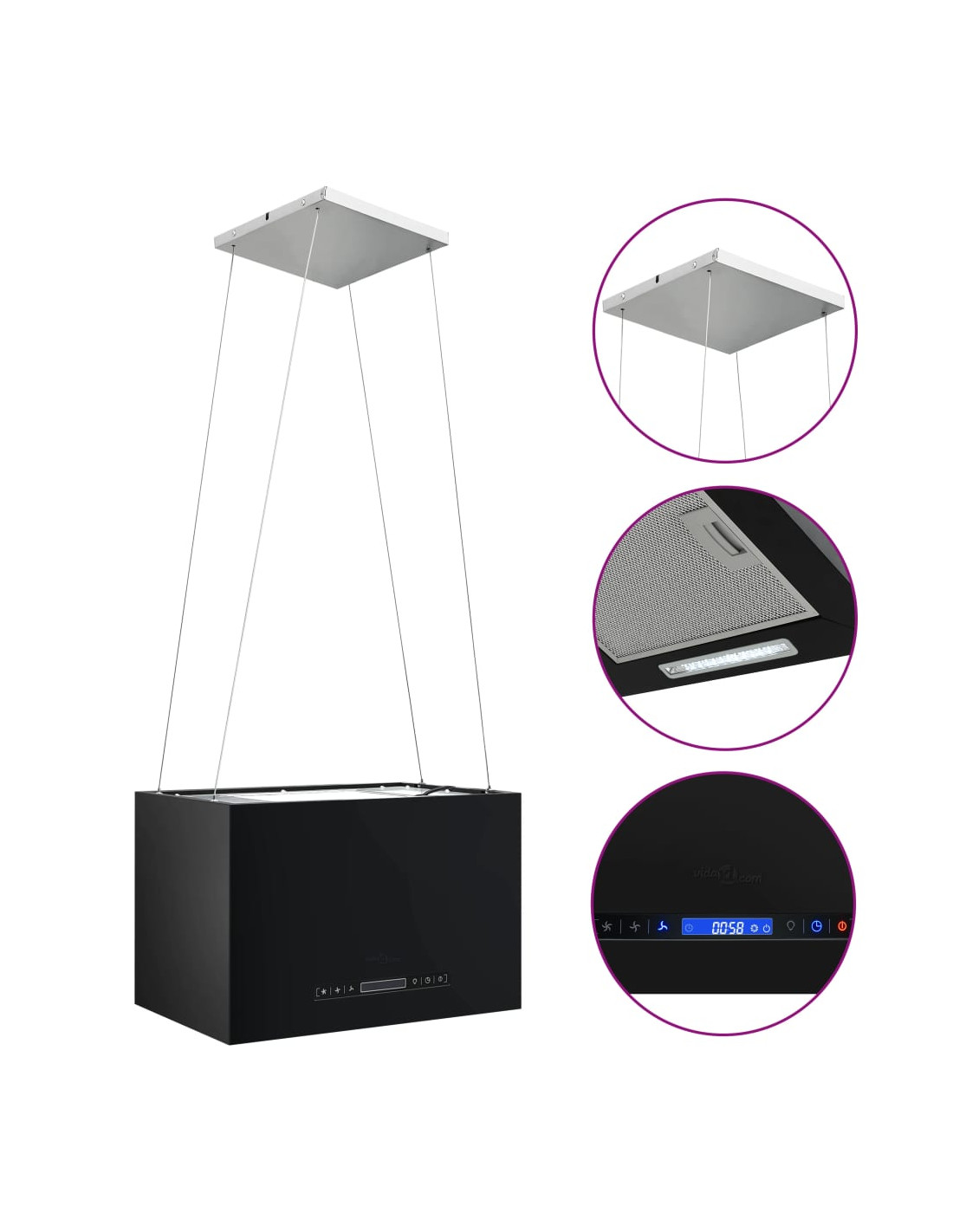 La nostra cappa a isola sospesa silenziosa e potente è l'ideale per aspirare efficacemente fumi, grasso, umidità e persino calore dalla vostra cucina. Il suo involucro in acciaio rivestito a polvere arricchirà la vostra cucina con un aspetto elegante e moderno.