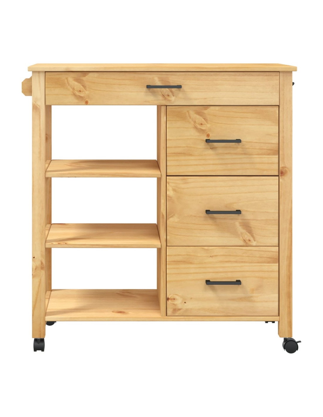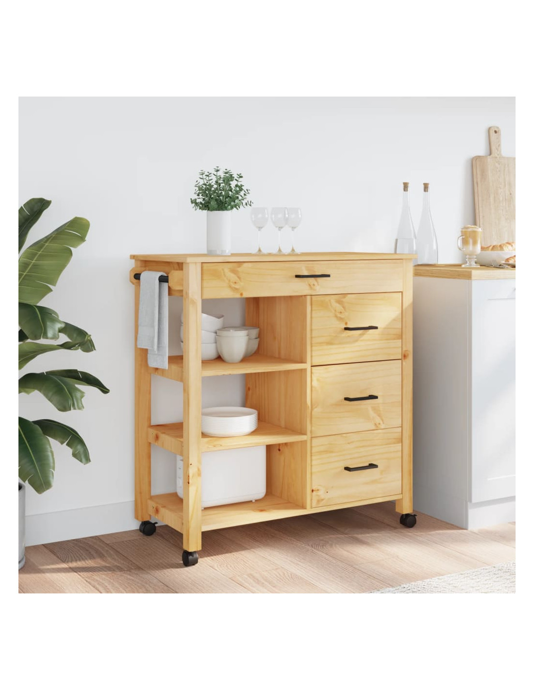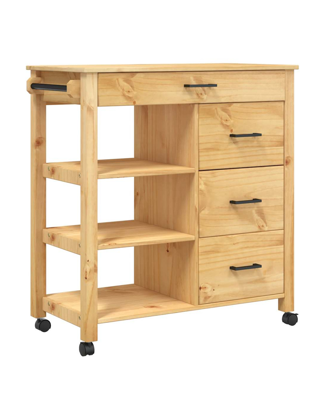 - Materiale resistente: Il legno massello di pino è un bellissimo materiale naturale. Il legno di pino ha le venature dritte, e i nodi conferiscono al materiale il suo caratteristico aspetto rustico. Realizzato in legno massello di pino, questo carrello portaoggetti da cucina è resistente e robusto.