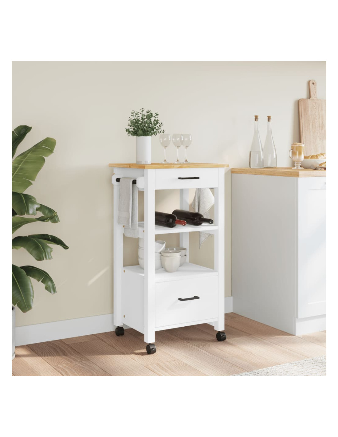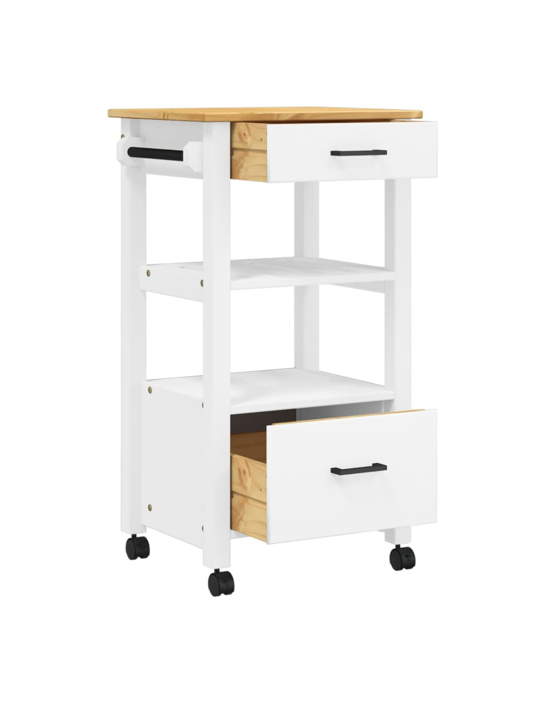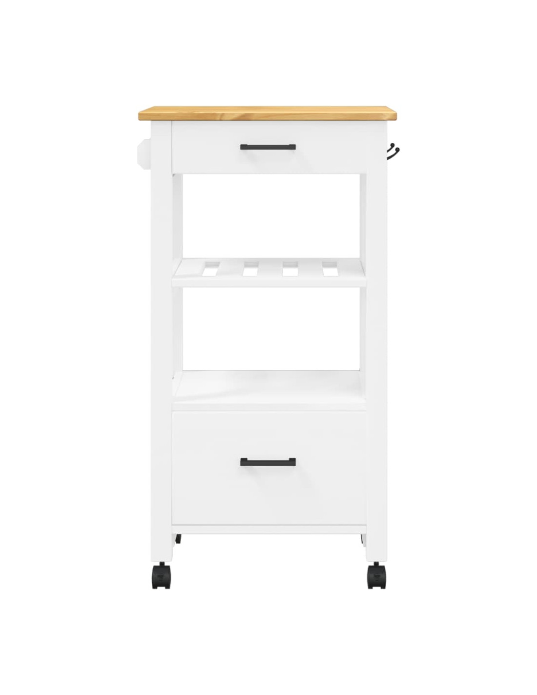 - Materiale resistente: Il legno massello di pino è un bellissimo materiale naturale. Il legno di pino ha le venature dritte, e i nodi conferiscono al materiale il suo caratteristico aspetto rustico. Realizzato in legno massello di pino, questo carrello portaoggetti da cucina è resistente e robusto.