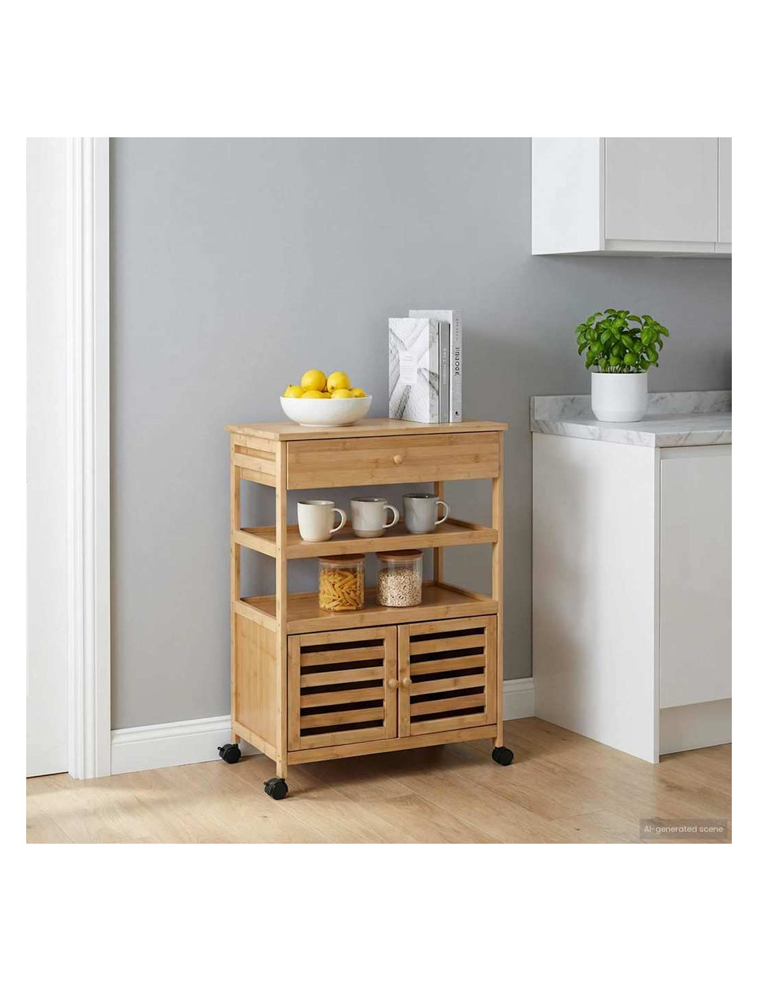 - Componenti inclusi: Il carrello ha porte a doghe, un compartimento, ruote e freni. Le porte a doghe ventilano gli oggetti dentro, mentre il grande compartimento è perfetto per utensili da cucina o altri indispensabili. Il design è pensato per essere pratico, con ruote bloccabili per stabilità quando è fermo. Questa costruzione intelligente rende tutto più conveniente in cucina.