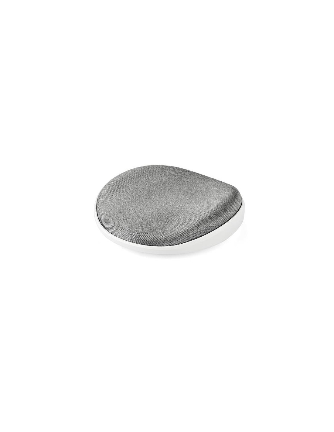 L'innovativo poggiapolso è caratterizzato da un moderno design a disco con una superficie superiore imbottita e sagomata che funge da cuscino per il polso. Sostiene delicatamente il polso, permettendo mantenerlo in posizione neutra durante l'uso del mouse. L'elegante tessuto di color argento sulla parte superiore e la base bianca completano la postazione di lavoro.