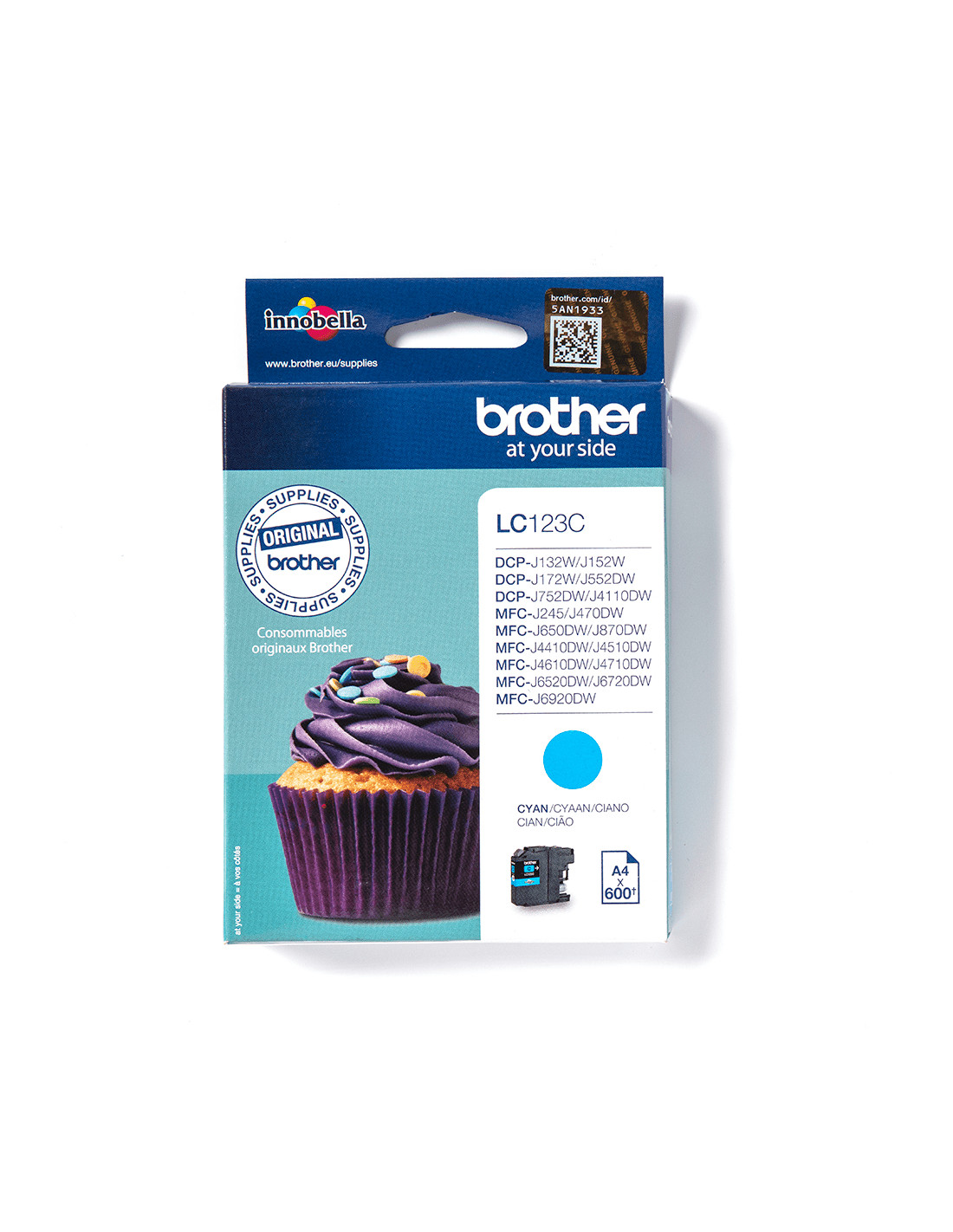 La cartuccia originale Brother LC123C è utilizzabile con DCP-J132W, DCP-J152W, DCP-J172W, DCP-J552DW, DCP-J752DW, DCP-J4110DW, MFC-J245, MFC-J470DW, MFC-J650DW, MFC-J870DW, MFC-J4410DW, MFC-J4510DW, MFC-J4610DW, MFC-J4710DW, MFC-J6520DW, MFC-J6720DW, MFC-J6920DW.
