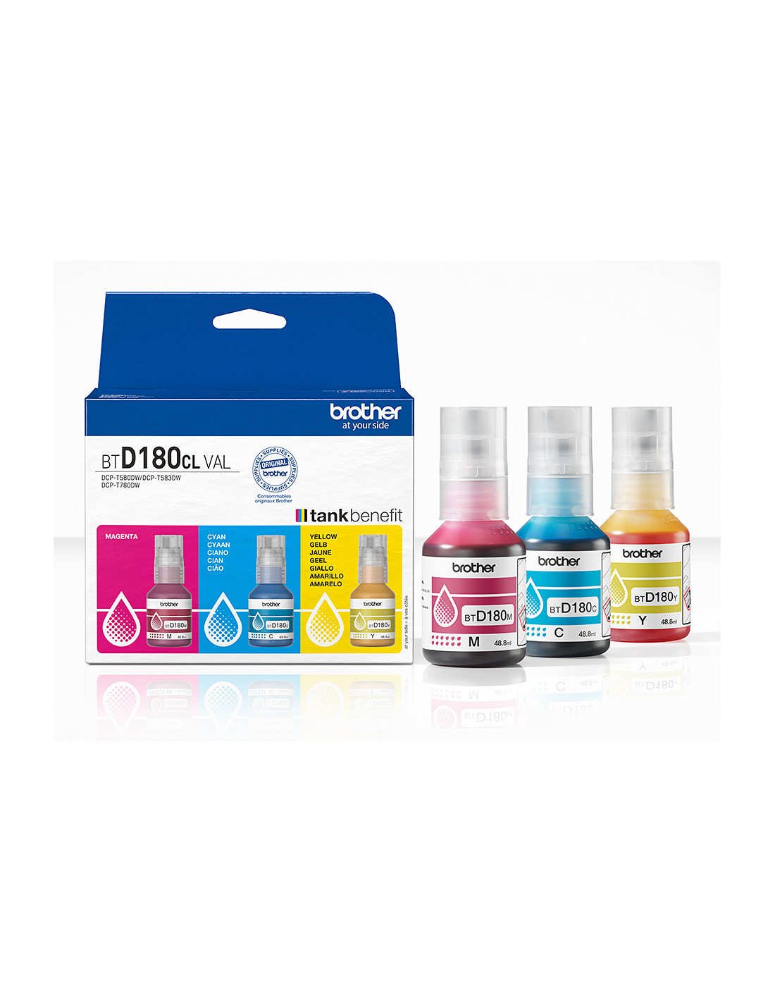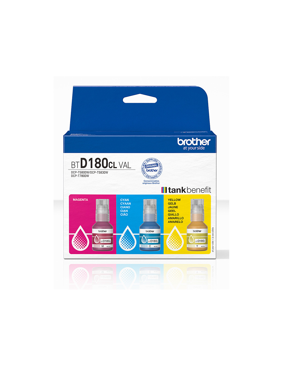 Brother BTD180CLVAL. Tipo: Originale, Colori di stampa: Ciano, Magenta, Giallo, Compatibilità marca: Brother. Quantità per pacco: 3 pz, Dimensioni (LxPxA): 40 x 100 x 45 mm, Larghezza imballo: 56 mm