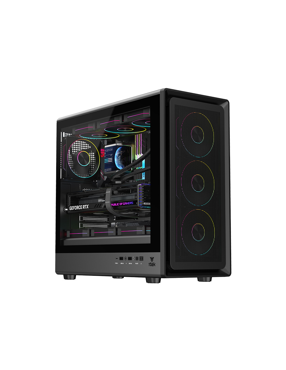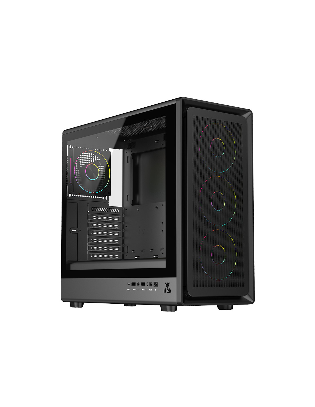 Nell’itek MESHCORE 36 le parole d'ordine sono: air flow, praticità ed estetica moderna. La paratia frontale è completamente traforata per permettere un ottimo flusso di aria, grazie anche alle 4 ventole ARGB in dotazione, 3 sul frontale e una sul retro, tutte collegate al comodo HUB con telecomando in dotazione. La struttura permette un assemblaggio facile e veloce, con il vano separato per l'alimentatore e i dischi HDD/SSD rendendo il tutto esteticamente molto bello e ordinato permettendo l'installazione di schede video di ultima generazione di lunghezza fino a 420mm, dissipatori alti 174mm, liquid cooling fino a 360mm, diverse ventole aggiuntive e il cable management è di 21mm. Sono presenti 2 porte USB 3.0 e una TypeC nella parte laterale del case! Disponibile nella versione Total Black o Full White!