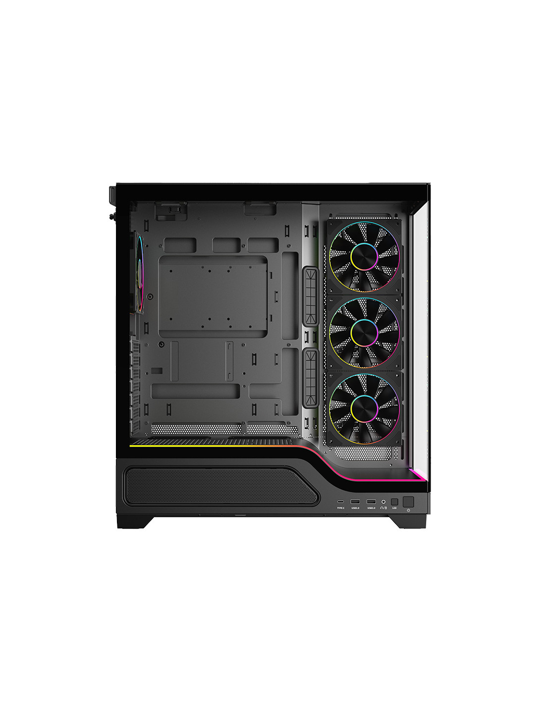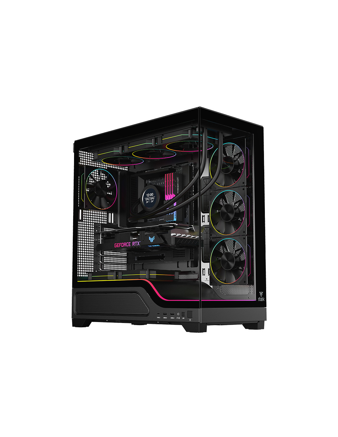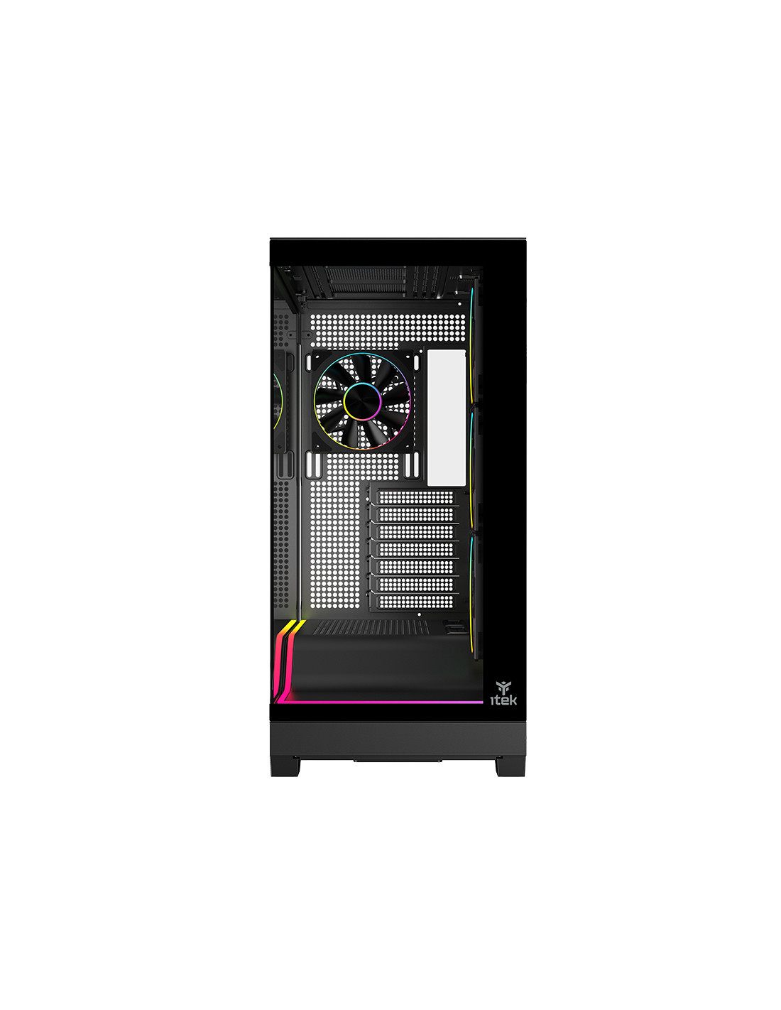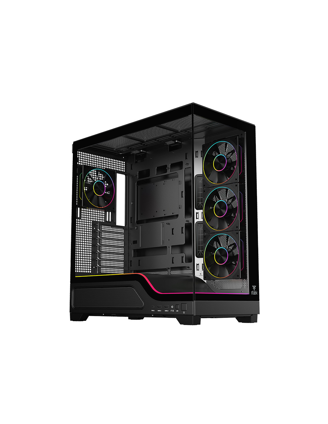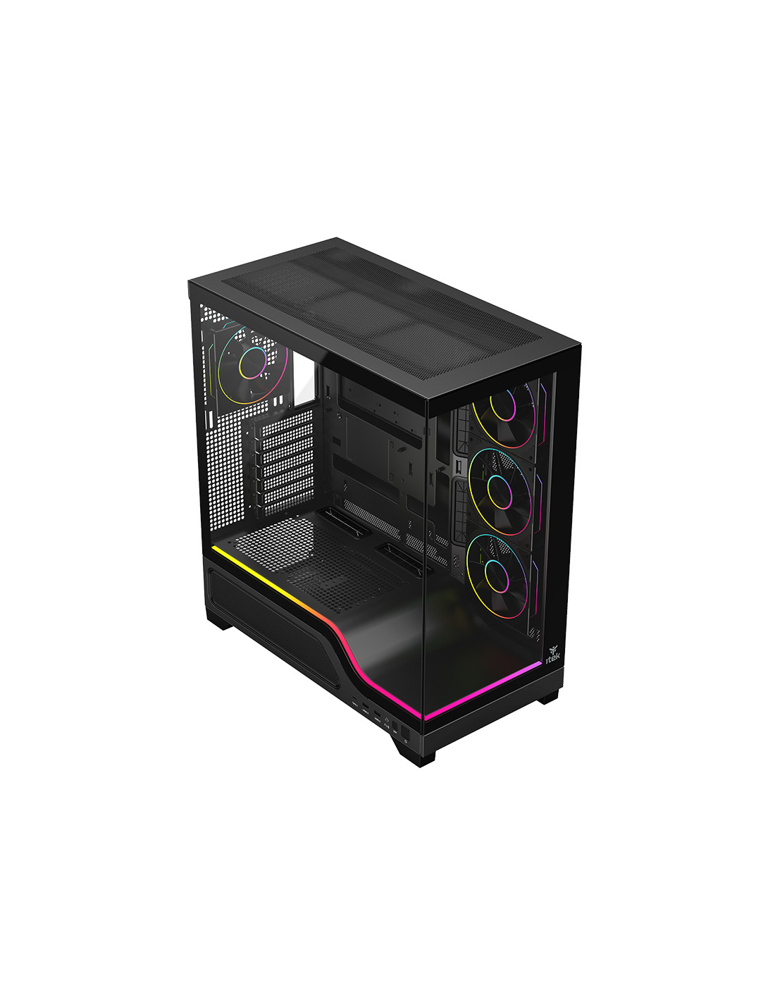 itek SHOWBUI WAVE 82 si presenta con nuovo look moderno e accattivante. La paratia frontale e laterale sono in vetro scuro temperato con apertura/chiusura ad incastro, senza viti!La struttura è solida e in grado di ospitare anche le nuove schede madri con connettori sul retro, per un effettivo visivo davvero super! Il vano che ospita l'alimentatore e i drive è parzialmente traforato e separato rispetto al resto del cabinet dove internamente lo spazio è tantissimo, infatti è possibile installare schede video di ultima generazione di lunghezza fino a 440mm, dissipatori alti 185mm, liquid cooling fino a 360mm, diverse ventole aggiuntive e il cable management è di 35mm. In dotazione sono presenti 4 ventole ARGB di ultimissima generazione per una resa estetica al top e un air flow ottimale. Tutte gestite dal comodo HUB e, in alternativa, dal tasto LED o direttamente dalla motherboard. Sono presenti 2 porte USB 3.0 e una TypeC nella parte inferiore laterale del case! disponibile nella versione total black o full white!