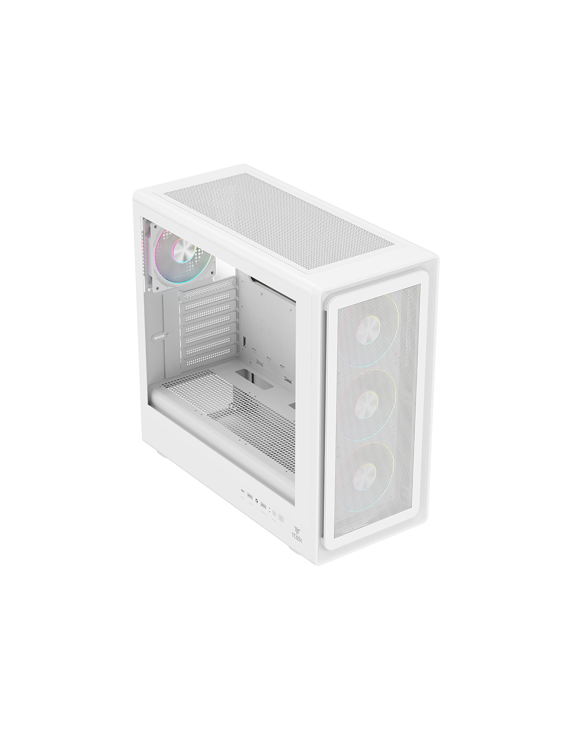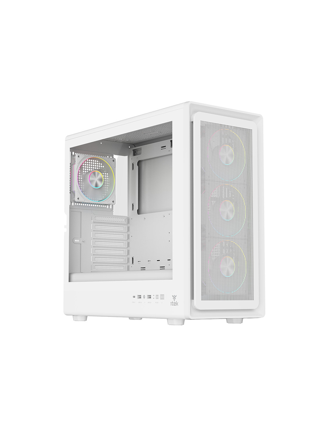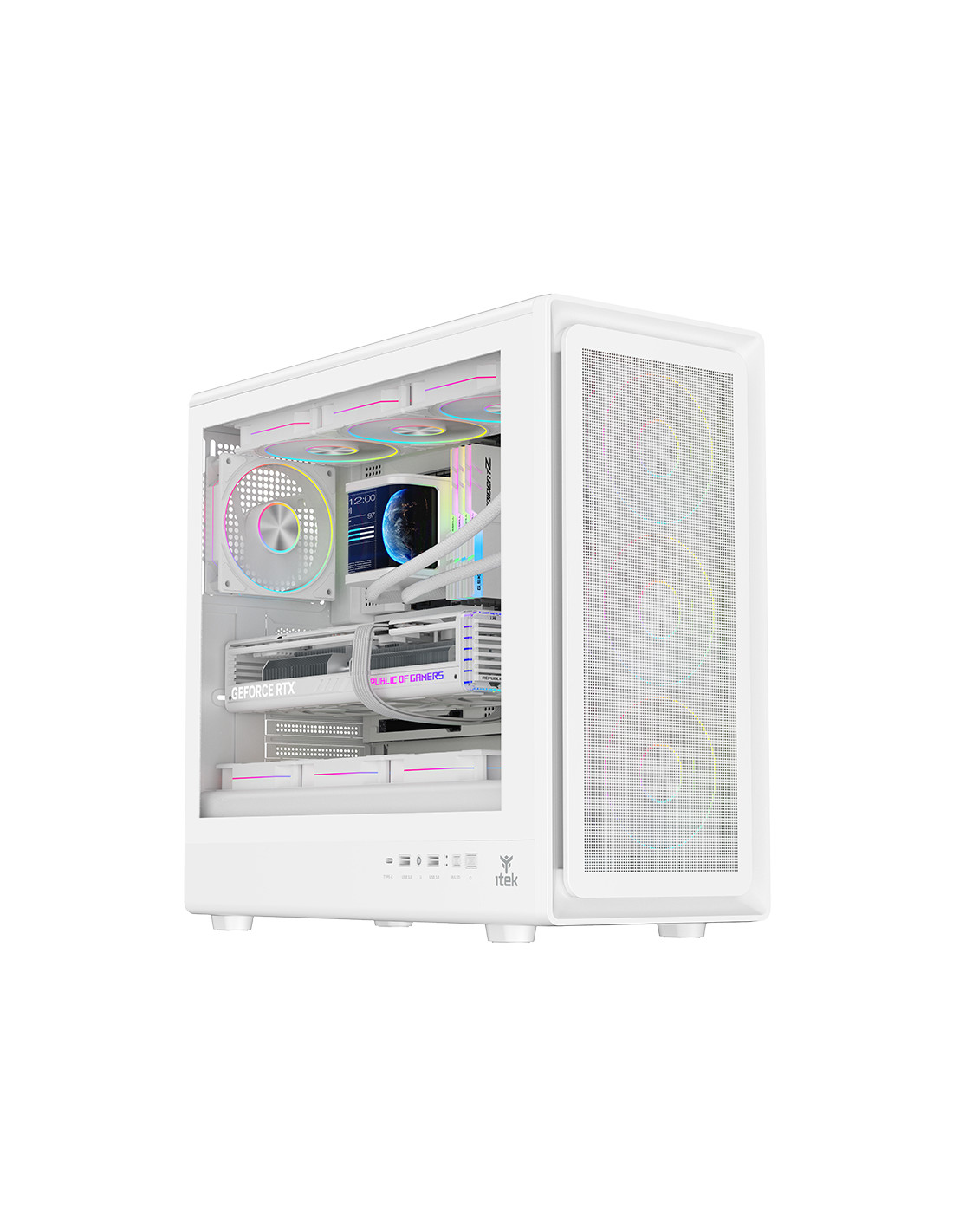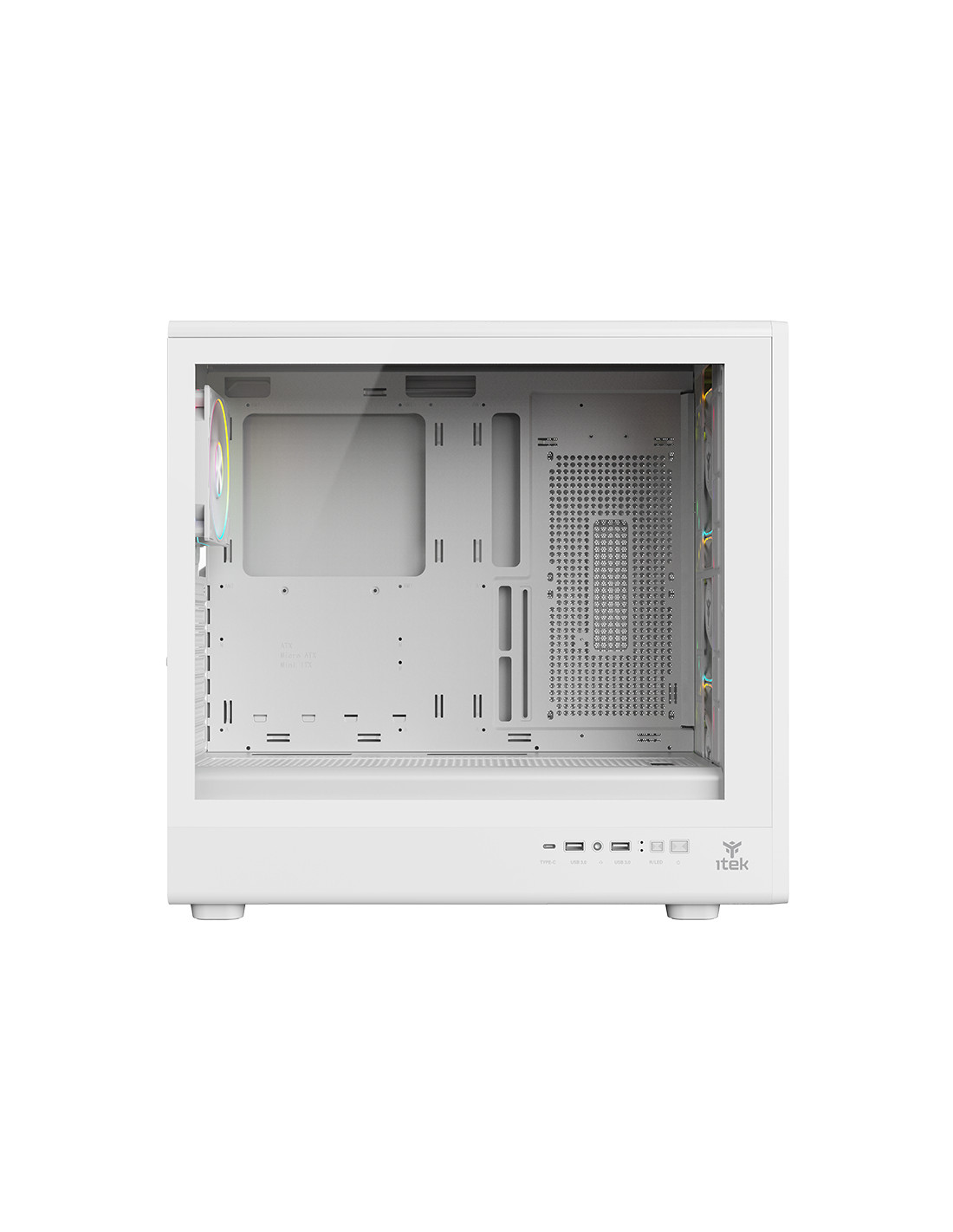 Nell’itek MESHCORE 36 le parole d'ordine sono: air flow, praticità ed estetica moderna. La paratia frontale è completamente traforata per permettere un ottimo flusso di aria, grazie anche alle 4 ventole ARGB in dotazione, 3 sul frontale e una sul retro, tutte collegate al comodo HUB con telecomando in dotazione. La struttura permette un assemblaggio facile e veloce, con il vano separato per l'alimentatore e i dischi HDD/SSD rendendo il tutto esteticamente molto bello e ordinato permettendo l'installazione di schede video di ultima generazione di lunghezza fino a 420mm, dissipatori alti 174mm, liquid cooling fino a 360mm, diverse ventole aggiuntive e il cable management è di 21mm. Sono presenti 2 porte USB 3.0 e una TypeC nella parte laterale del case! Disponibile nella versione Total Black o Full White!