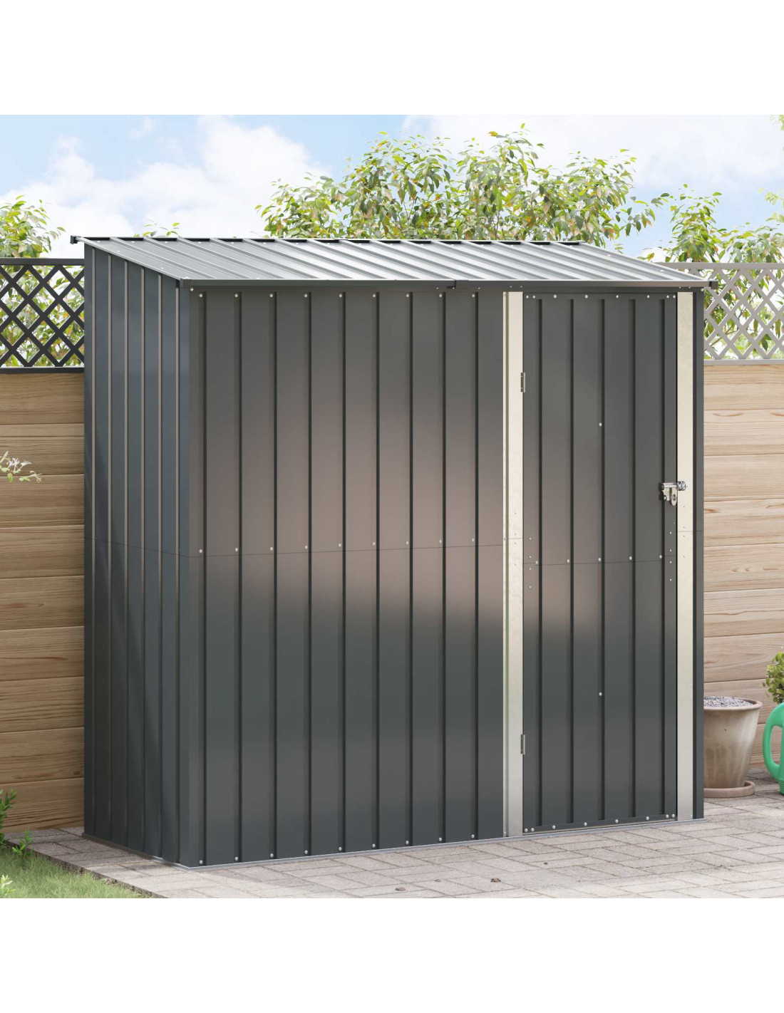 - Scarico efficiente dell'acqua Il tetto inclinato è progettato per far defluire l'acqua piovana in modo efficace. Questo evita l'accumulo d'acqua e mantiene l'ambiente di stoccaggio asciutto e sicuro per tutte le tue cose.