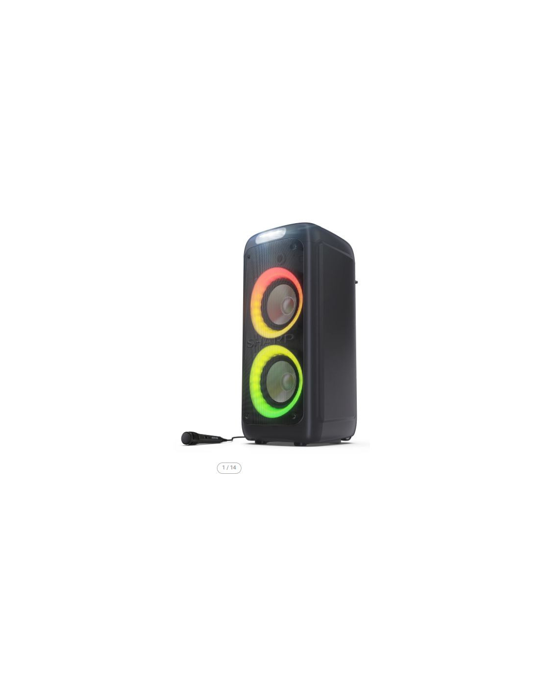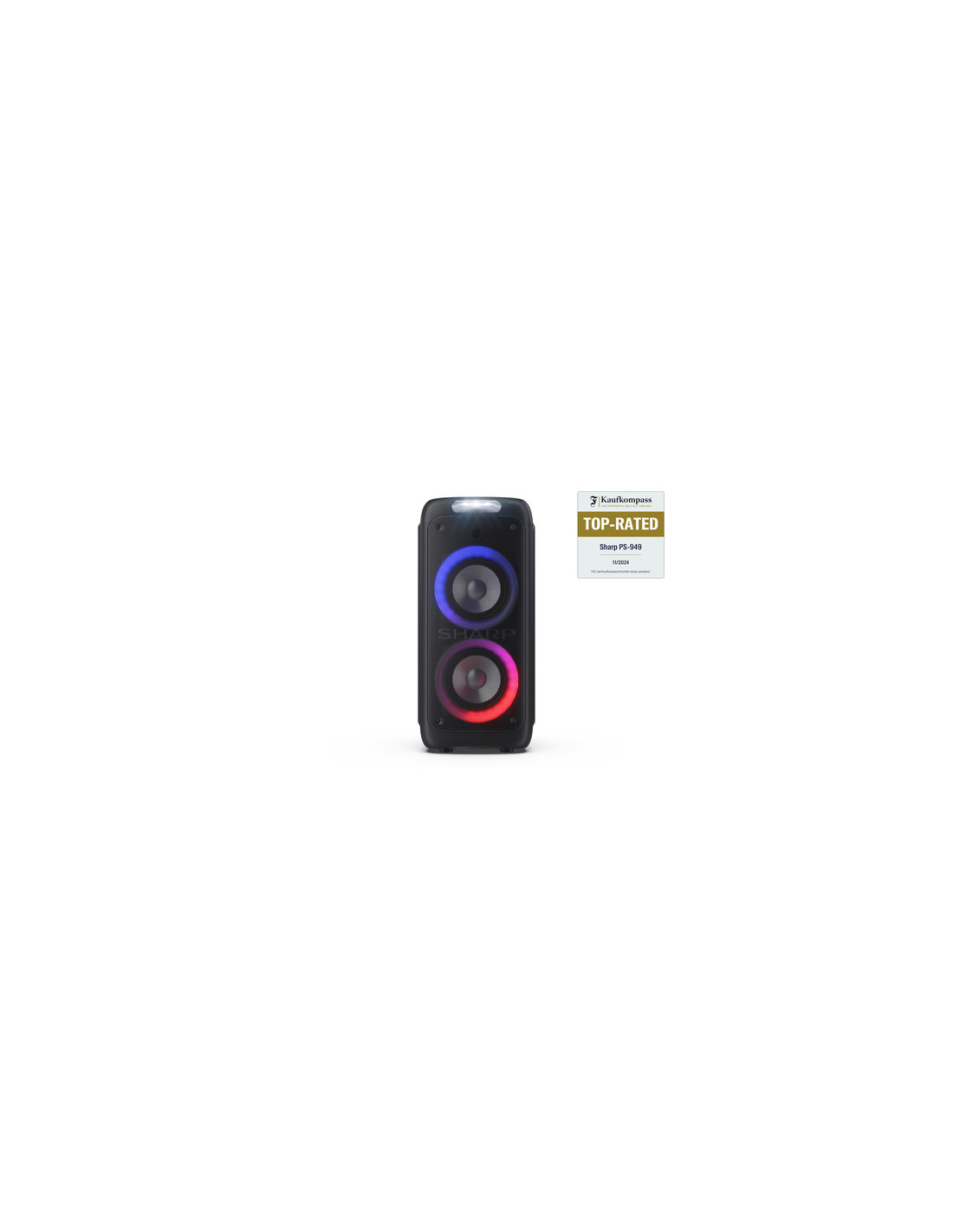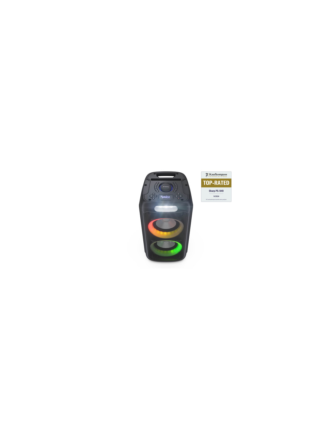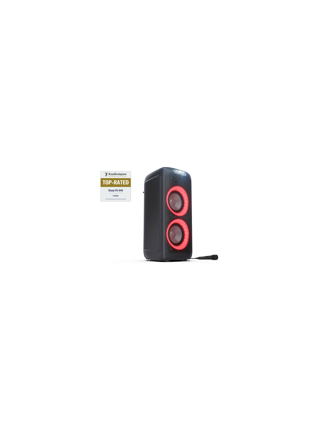 Sharp PS-949. Sistema audio: 2.1 canali, Diametro del woofer: 20,3 cm (8"). PMPO (Potenza musicale di picco): 132 W. Tecnologia di connessione: Con cavo e senza cavo, Profili Bluetooth: A2DP, AVRCP. Tipo di prodotto: Altoparlante da festa, Colore del prodotto: Nero, Materiale della scocca: Plastica. Utilizzo raccomandato: Universale, Certificazione: CE (RED, RoHS, ErP), REACH/PAH/SCCP