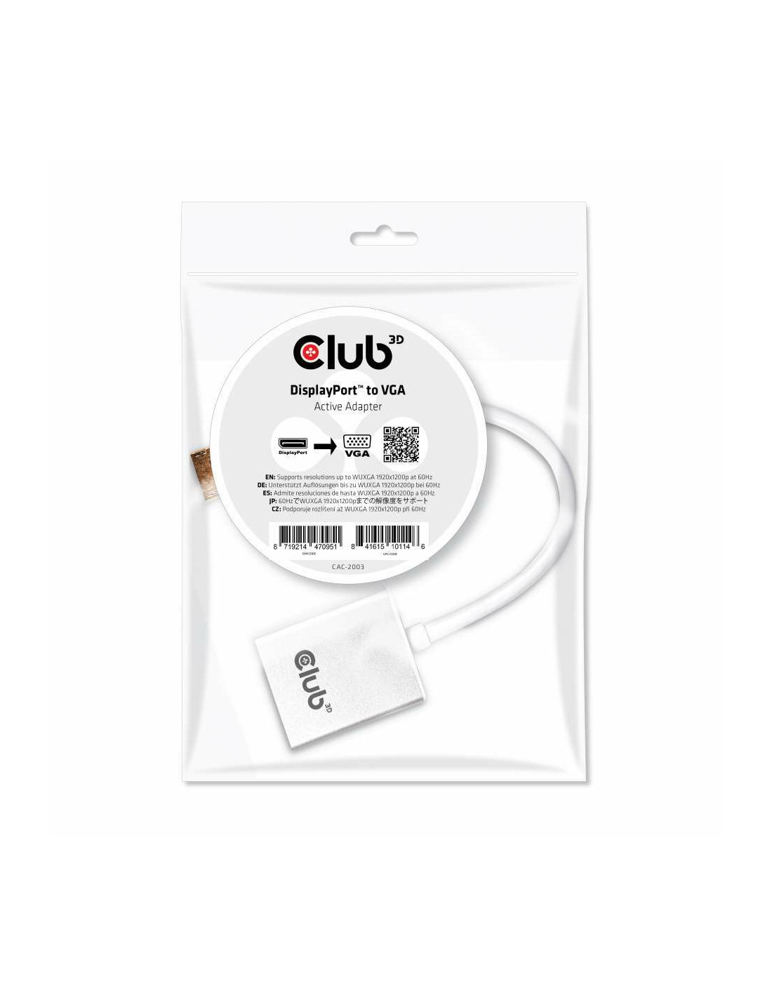 CLUB3D Displayport to VGA Active Adapter. Connettore 1: DisplayPort, Connettore 2: VGA, Genere del connettore 1: Maschio. Certificati di conformità: RoHS, Certificazione: Meets ROHS, FCC, and CE EMI requirements. Peso dell'imballaggio in plastica: 9 g. Peso: 42 g, Larghezza: 250 mm, Profondità: 38 mm. Larghezza imballo: 160 mm, Profondità imballo: 18 mm, Altezza imballo: 240 mm