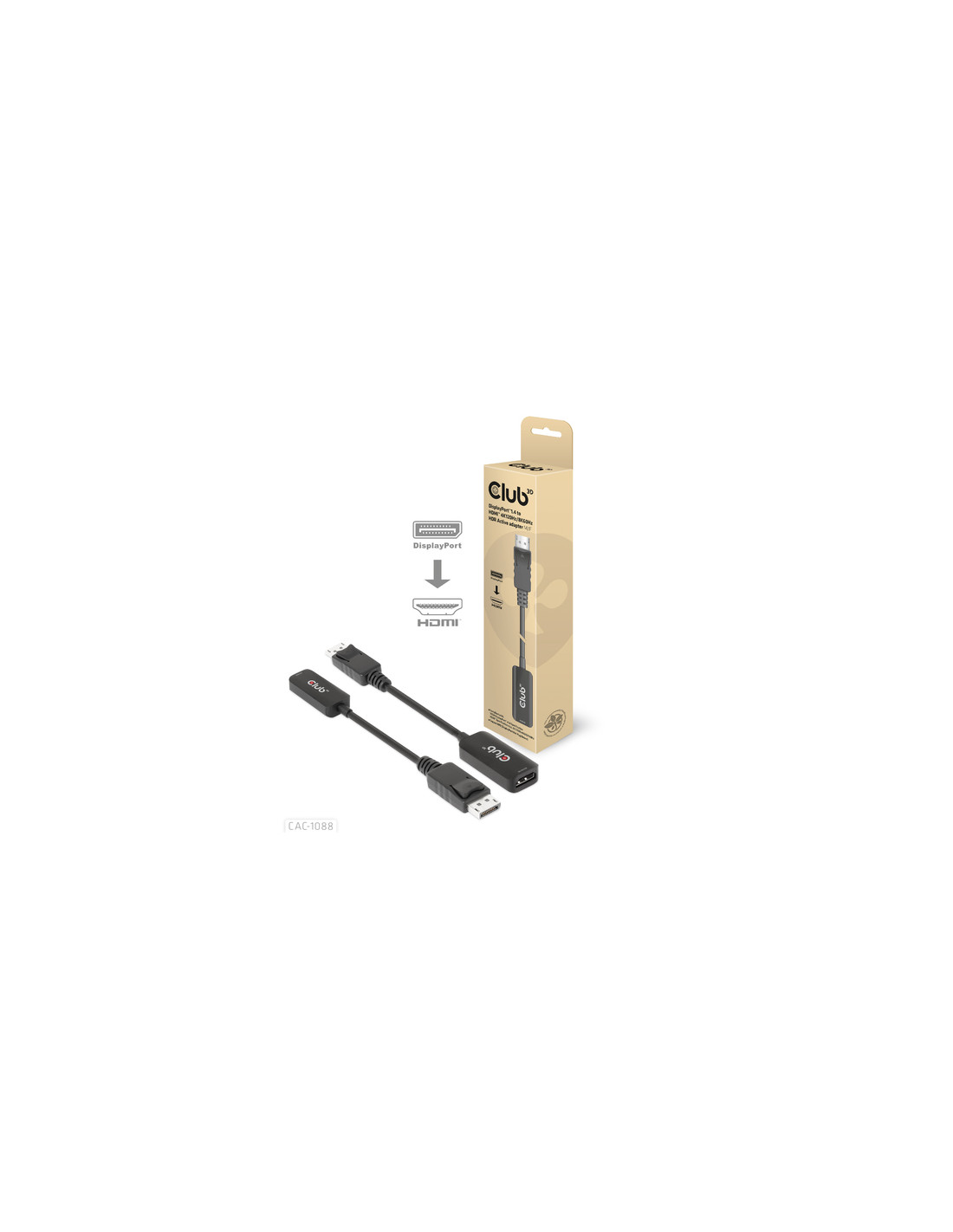 CLUB3D CAC-1088. Lunghezza cavo: 0,21 m, Connettore 1: DisplayPort, Connettore 2: HDMI. Peso dell'imballaggio in plastica: 5 g, Peso dell’imballaggio in carta/cartone: 28 g. Larghezza: 49 mm, Profondità: 22,5 mm, Altezza: 11,5 mm. Codice del Sistema Armonizzato (SA): 8544 4290