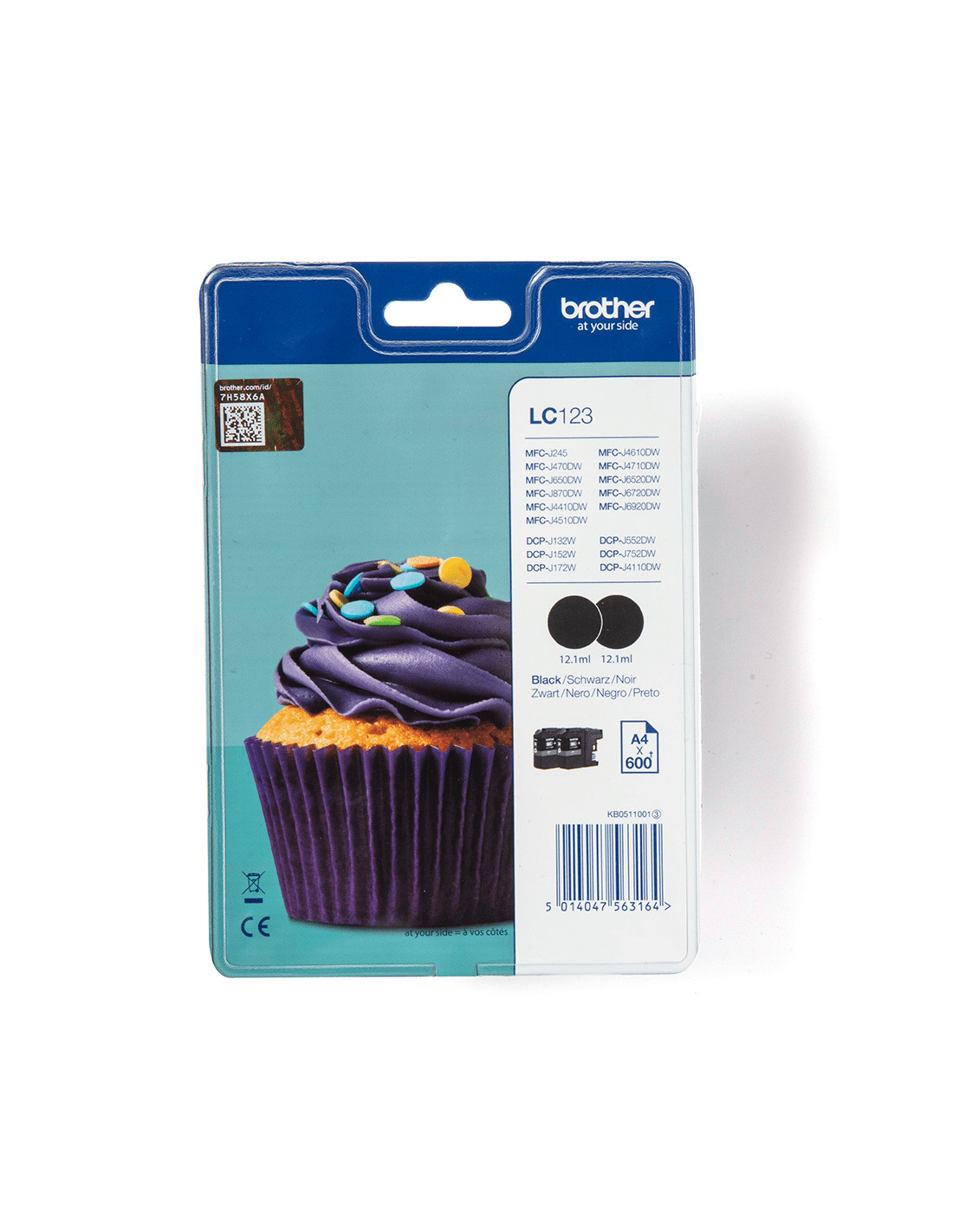 Brother LC123BKBP. Tipo di inchiostro nero: Inchiostro a base di pigmento, Tipo di fornitura: Confezione singola, Colori di stampa: Nero, Quantità per pacco: 1 pz, Resa in pagine dell'inchiostro a colori: 600 pagine