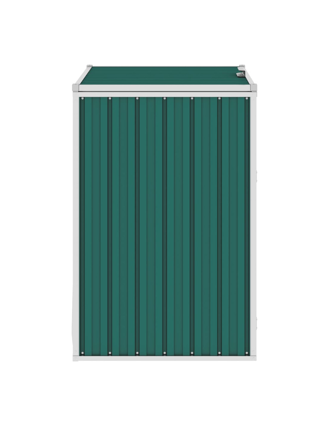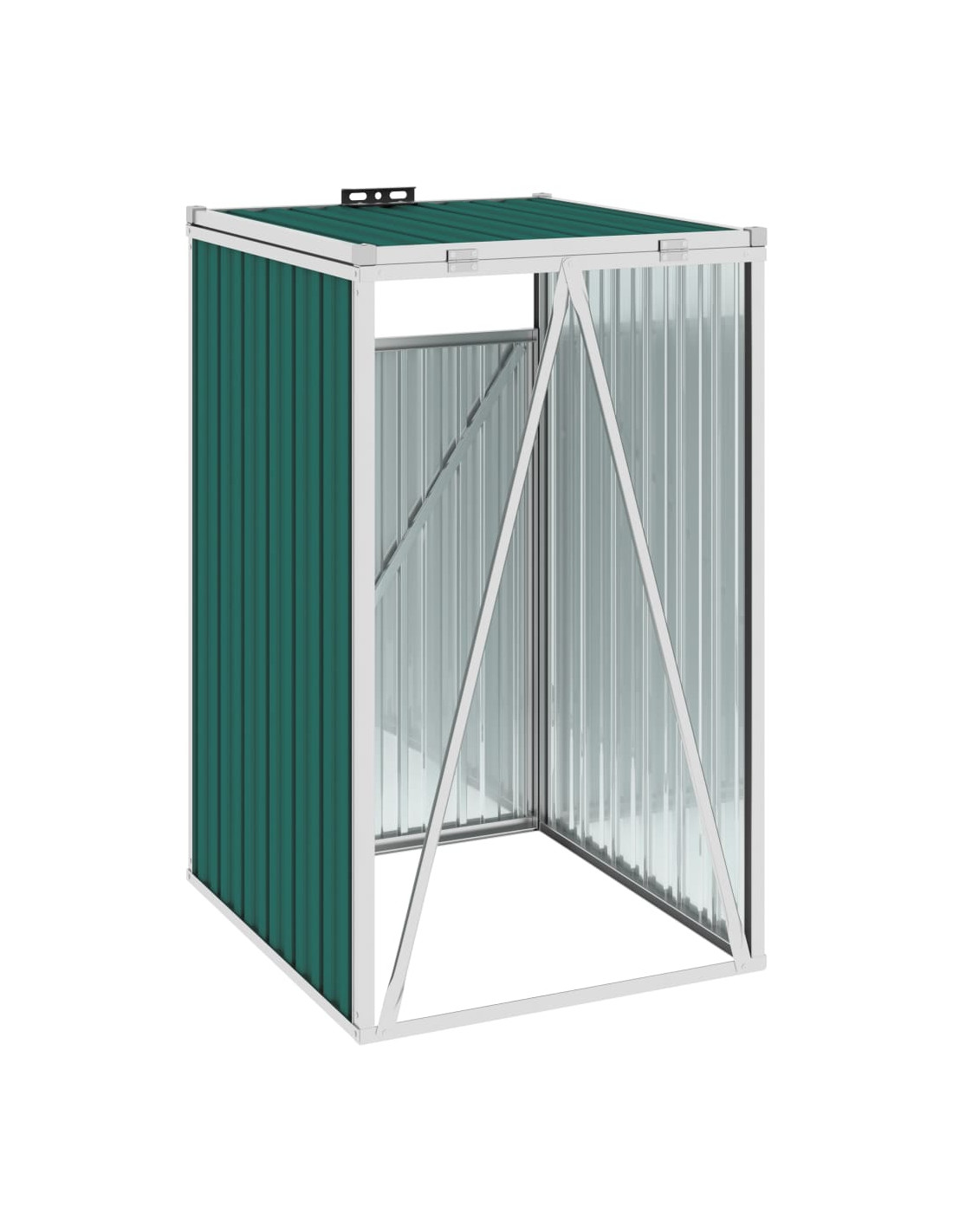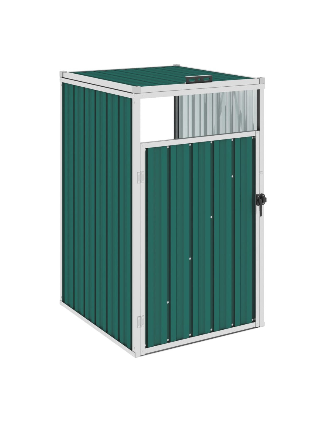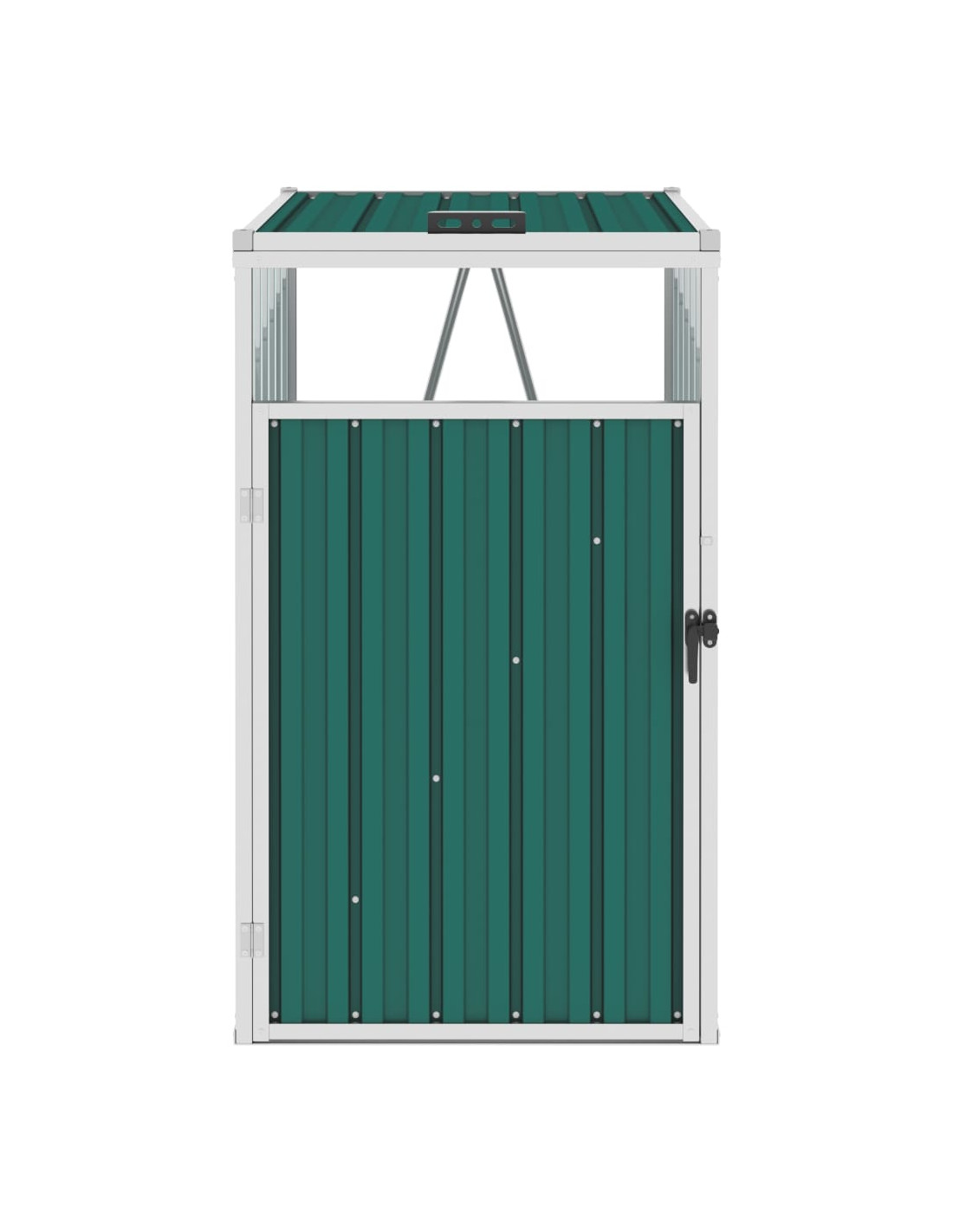Questo capanno è realizzato in robusto acciaio zincato, che lo rende molto stabile e di facile manutenzione. È dotato di anta di apertura frontale e di maniglia di plastica nera per consentire di rimuovere e svuotare facilmente la pattumiera. Il copri bidone ha un coperchio di sollevamento che può essere aperto per depositare facilmente i rifiuti.