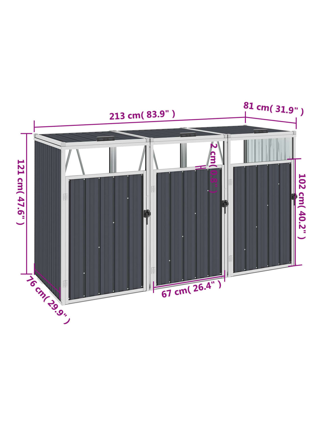 Questo copri bidone triplo è realizzato in robusto acciaio zincato, materiale che rende il prodotto molto robusto e di facile manutenzione. È dotato di tre porte apribili individualmente nella parte anteriore e maniglie delle porte in plastica nera. Grazie a queste caratteristiche i bidoni possono essere facilmente rimossi e svuotati. Il copri bidone doppio include tre coperchi sollevabili singolarmente che possono essere aperti per depositare facilmente i rifiuti.
