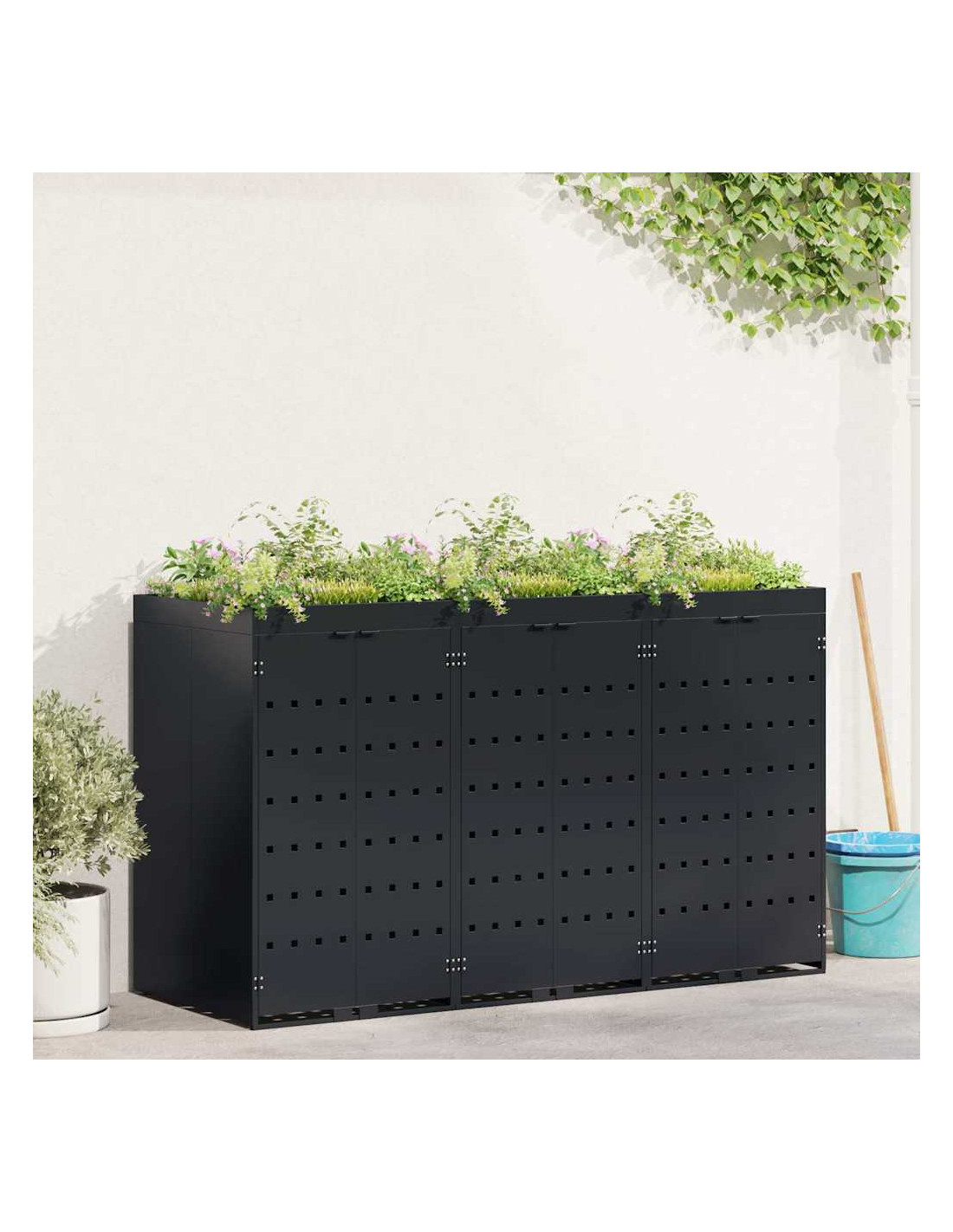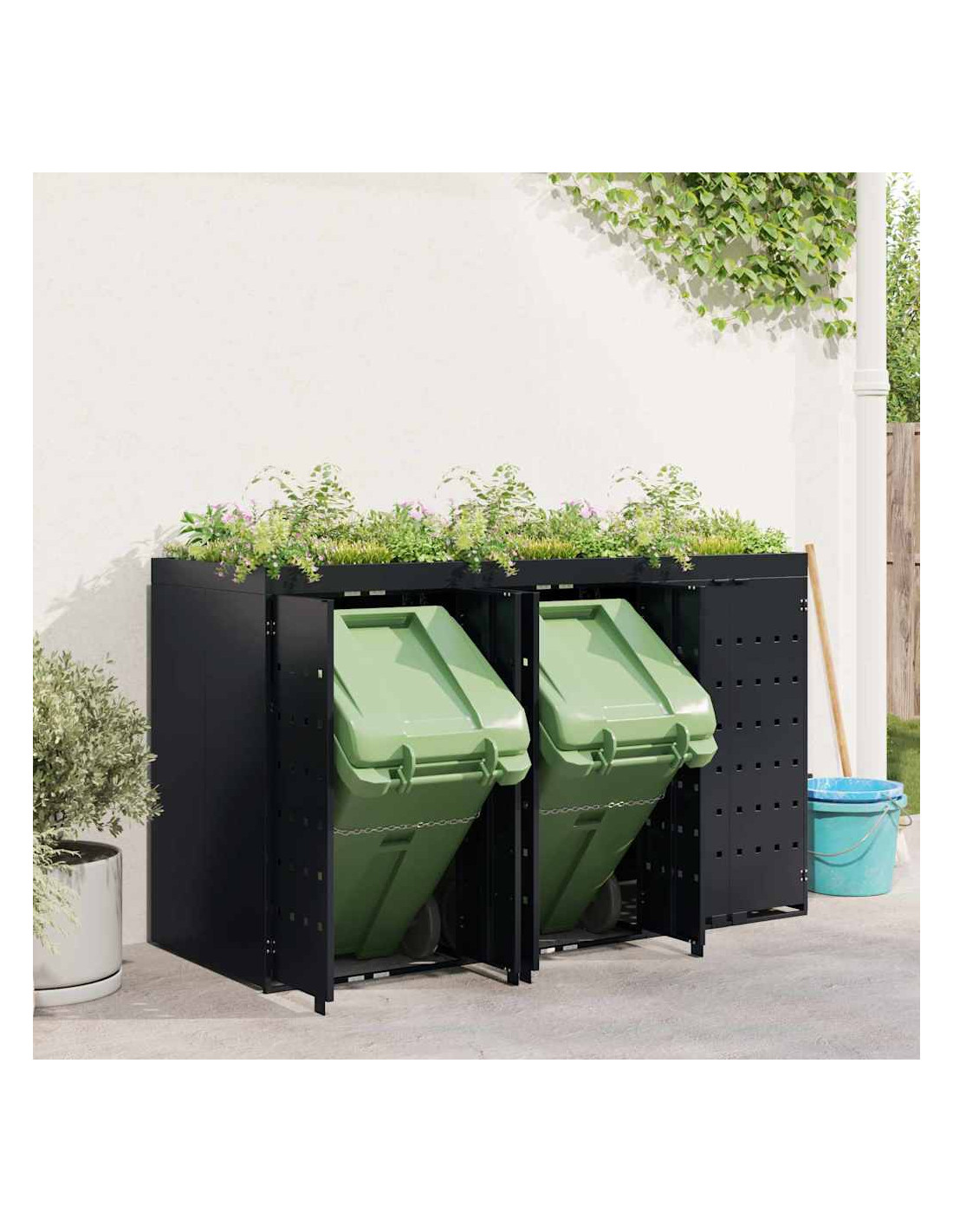 Questo contenitore per rifiuti con tetto da giardino è una soluzione chic per mantenere in ordine l'area esterna. È progettato per adattarsi bene a giardini e terrazze. Con il suo design minimale e linee pulite, si integra facilmente in ogni ambiente moderno. Nasconde i bidoni in modo elegante e permette di coltivare piante o erbe, portando un po'di natura nel tuo spazio.